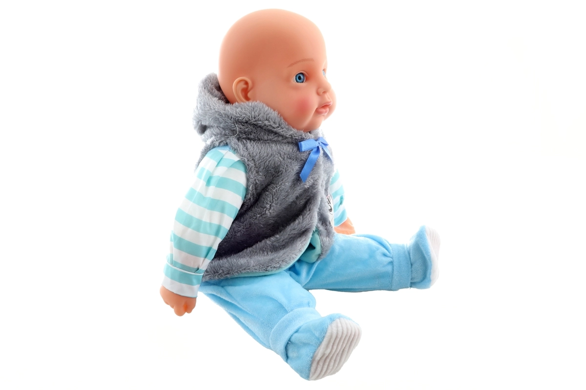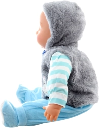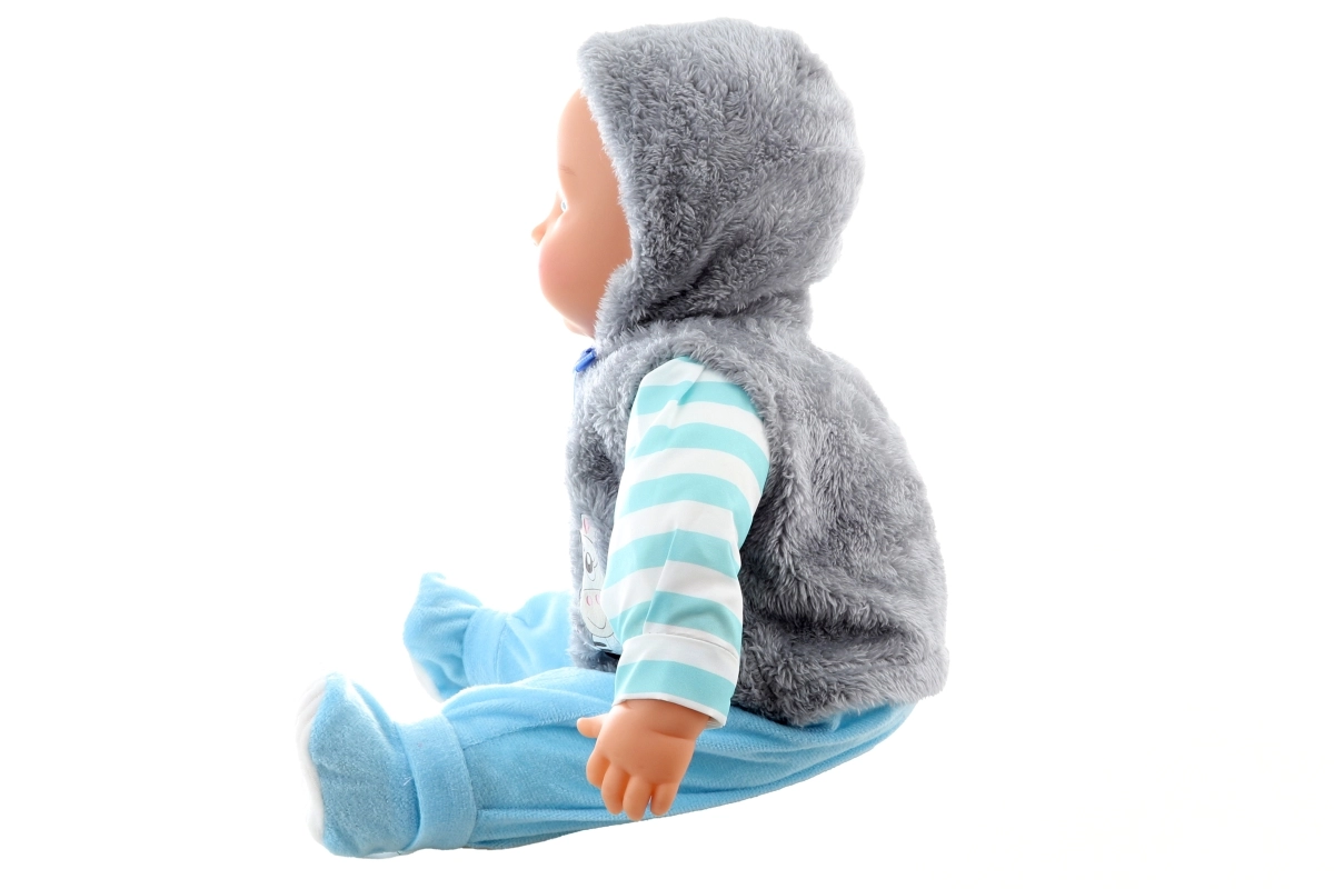 Тази голяма кукла – бебе момче – е създадена за автентична игра на грижи. Мекото телце приканва към гушкане, а пластмасовата глава и краищата на крайниците придават реалистична визия. Благодарение на раирания тишърт, сините панталони и меката елека изглежда като истинско бебе, което децата обичат да обличат и да носят.