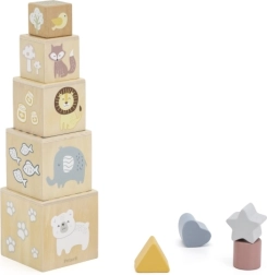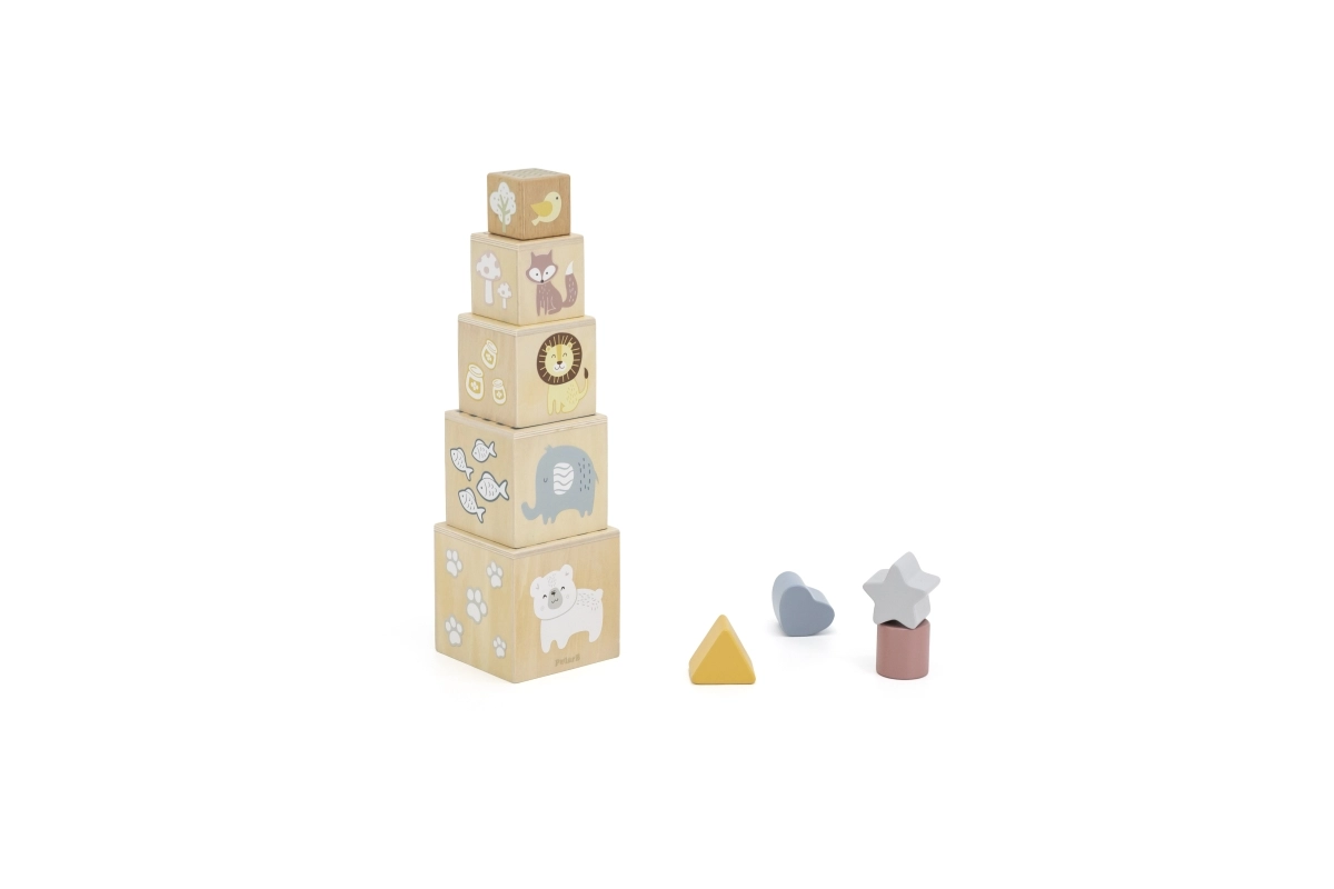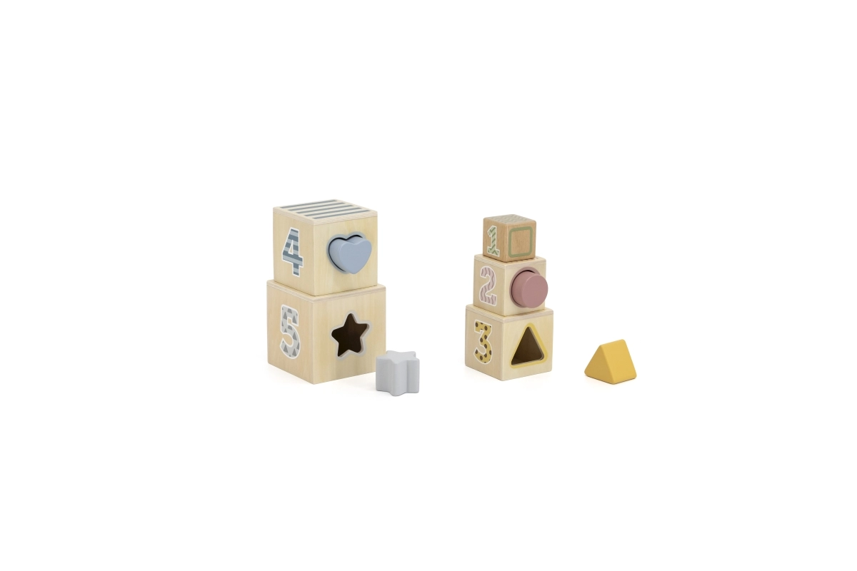 Пет кубчета и съответстващи форми учат децата да разбират размер, числа и пространствено възприятие. Комплектът подпомага логическото мислене и фината моторика.