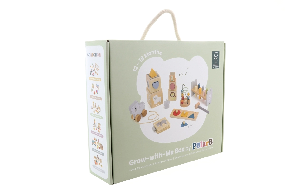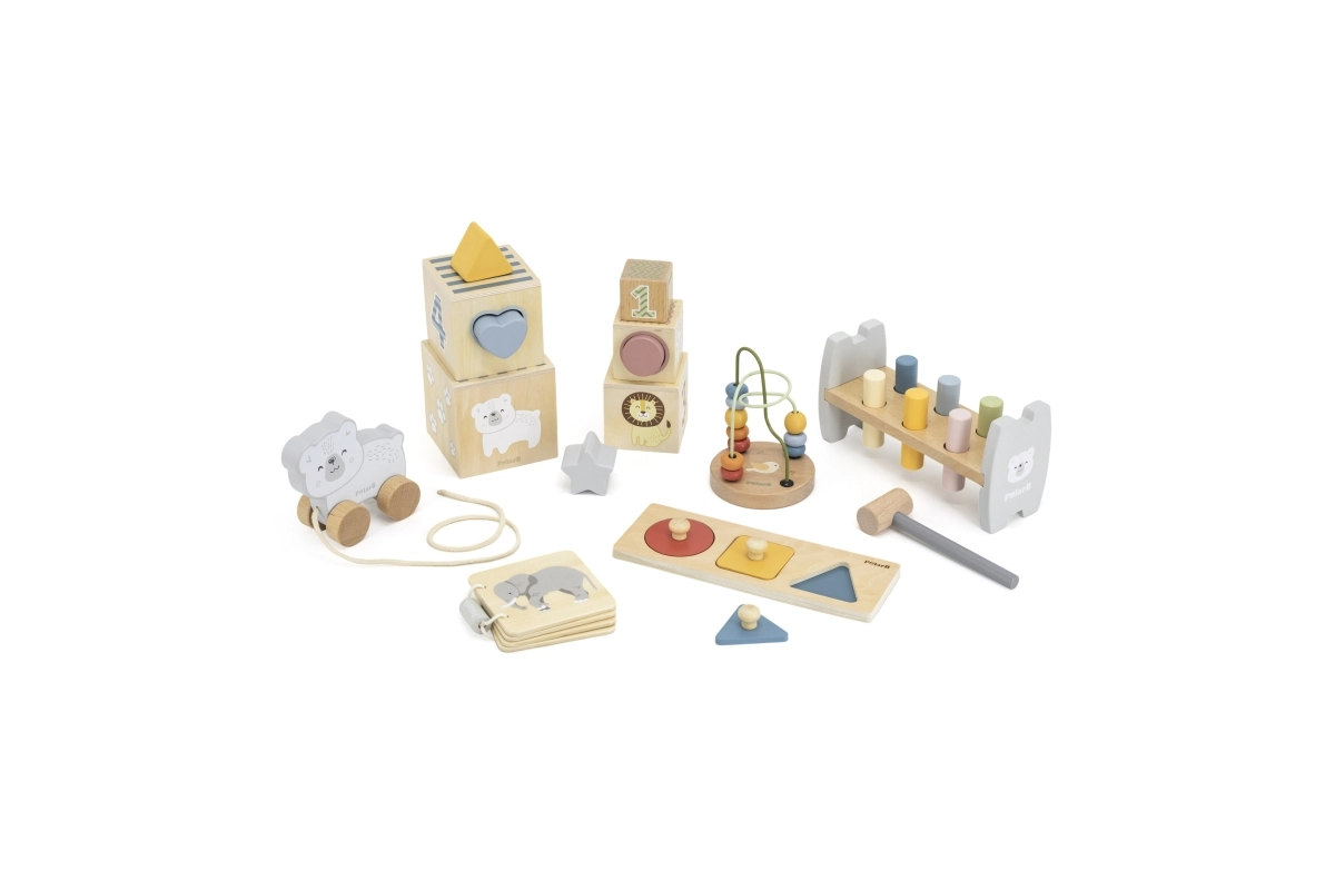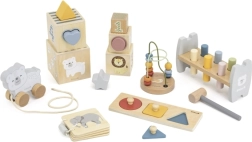 Открийте интелигентен дървен комплект за най-малките, който подпомага фината и грубата моторика, координацията око–ръка и разпознаването на форми и цветове. Практичната подаръчна кутия с дръжка включва любими активности – ударна пейка, петстепенни кубчета, пъте с мъниста, форми за вгнездяване и дървено меченце за дърпане – всичко в безопасно изпълнение от качествено дърво.