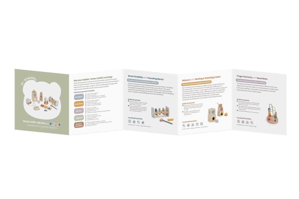 - Многостранни активности: ударна пейка, кула от пет кубчета и вгнездяване на форми, пъте с мъниста, лесни пъзели и животинка за дърпане