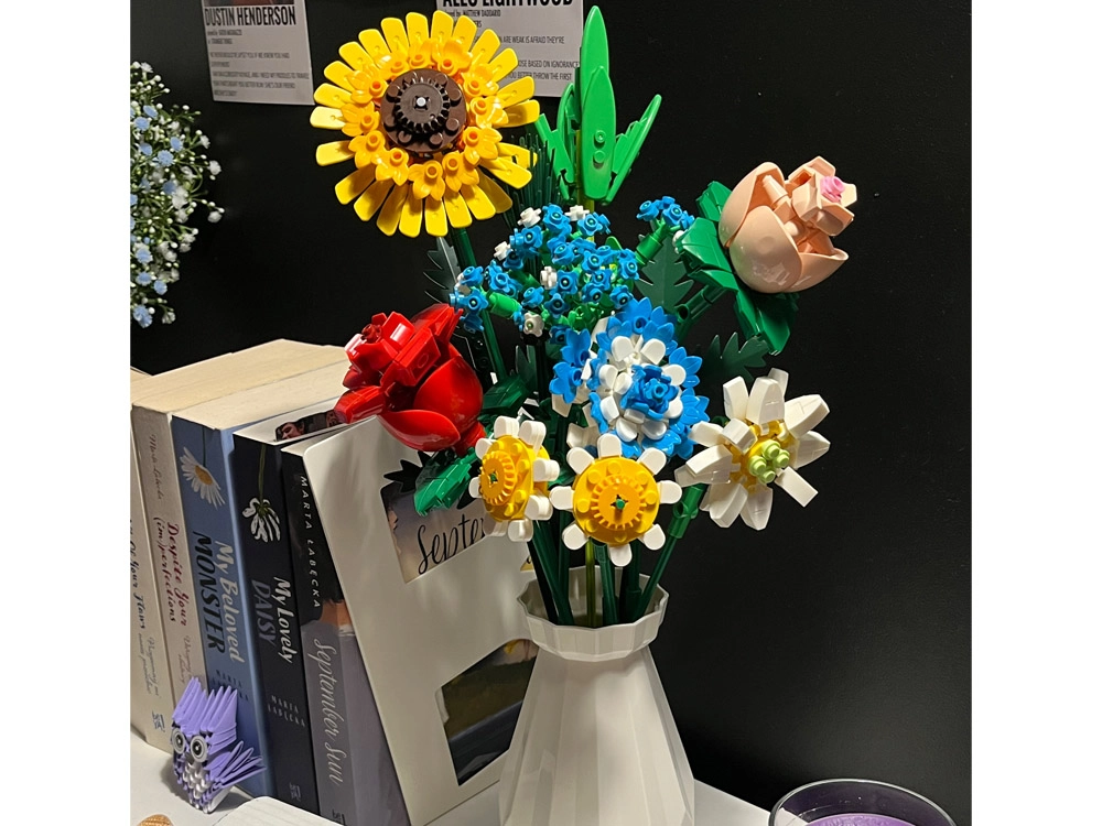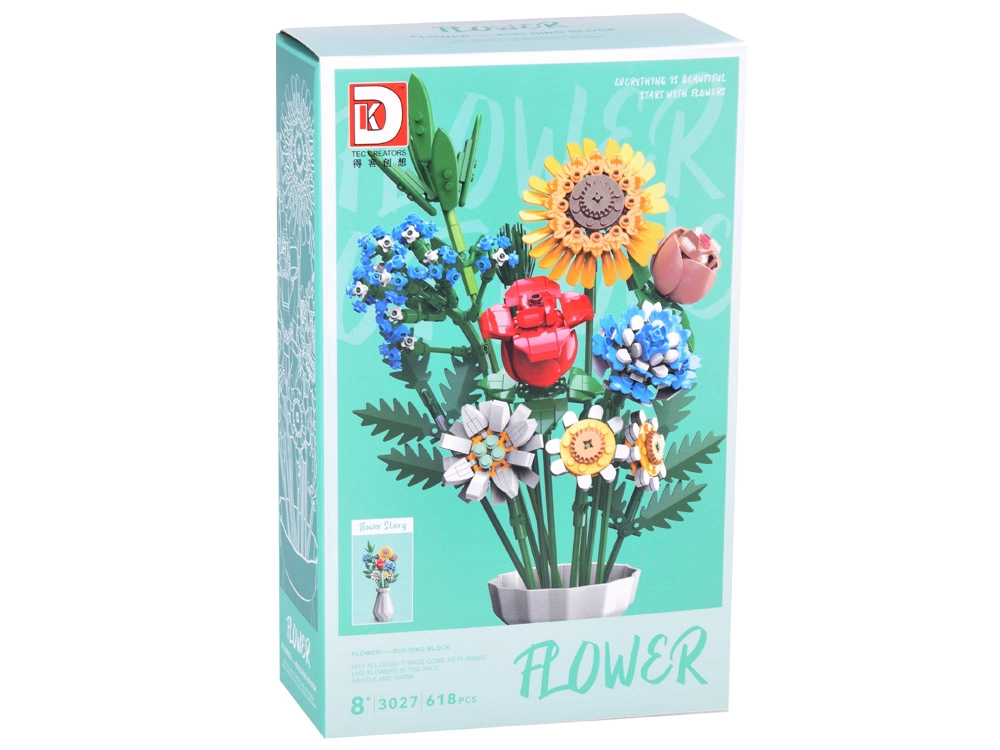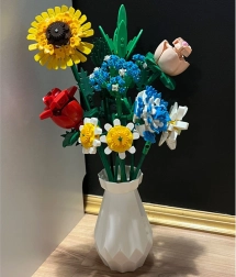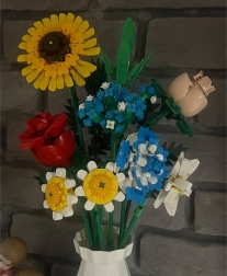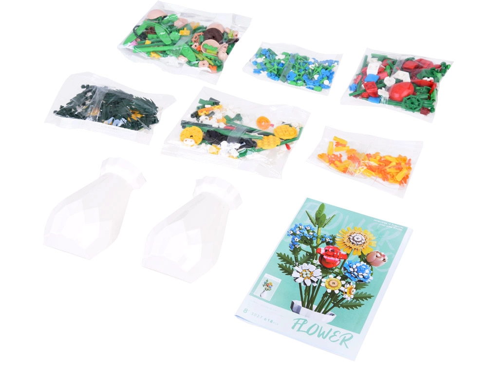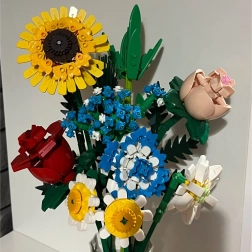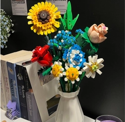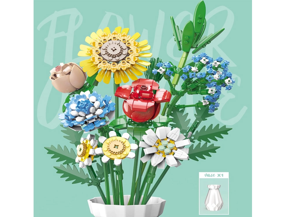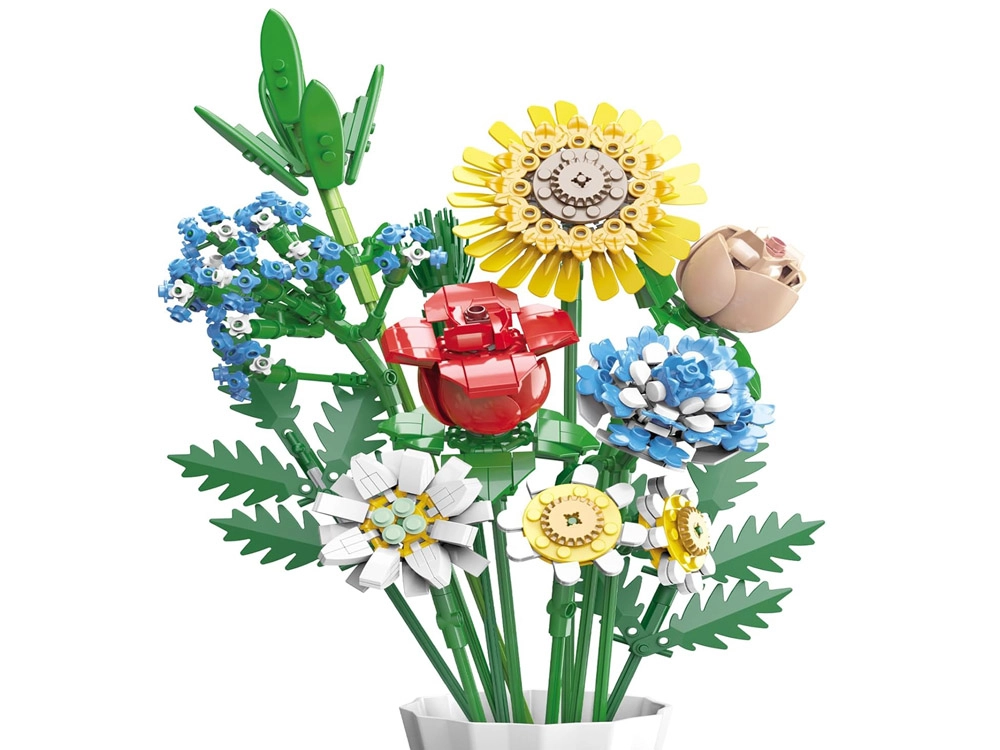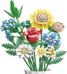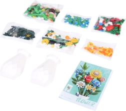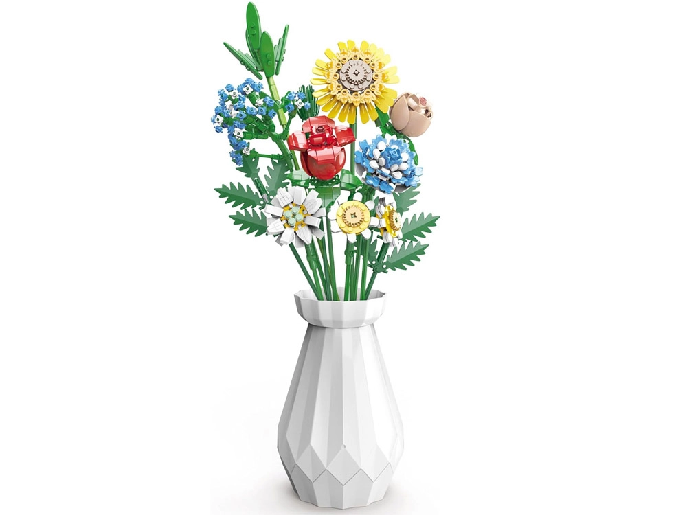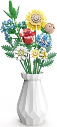 Превърнете конструктора в дизайнерска декорация. Пъстрият букет от строителни елементи включва слънчоглед, рози, карамфил, маргаритка, лилия, незабравка и зелени допълнения (листa хайтонг, кедър, трева). Част от комплекта е и елегантен кремав флакон, така че готовият букет можете веднага да изложите на рафт или маса.