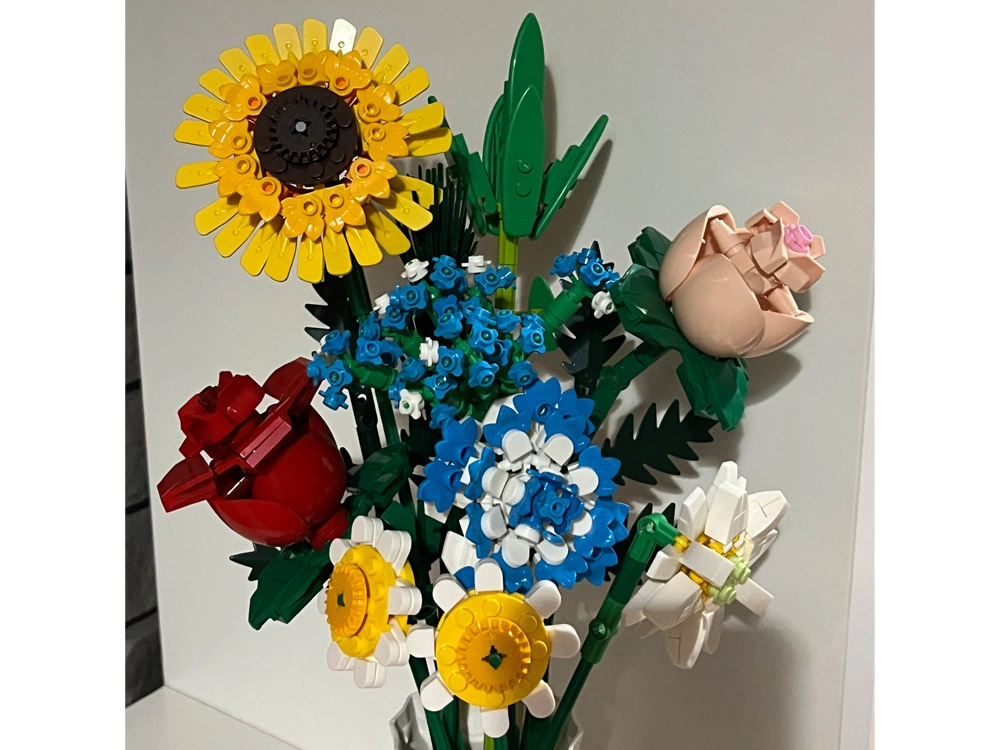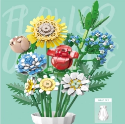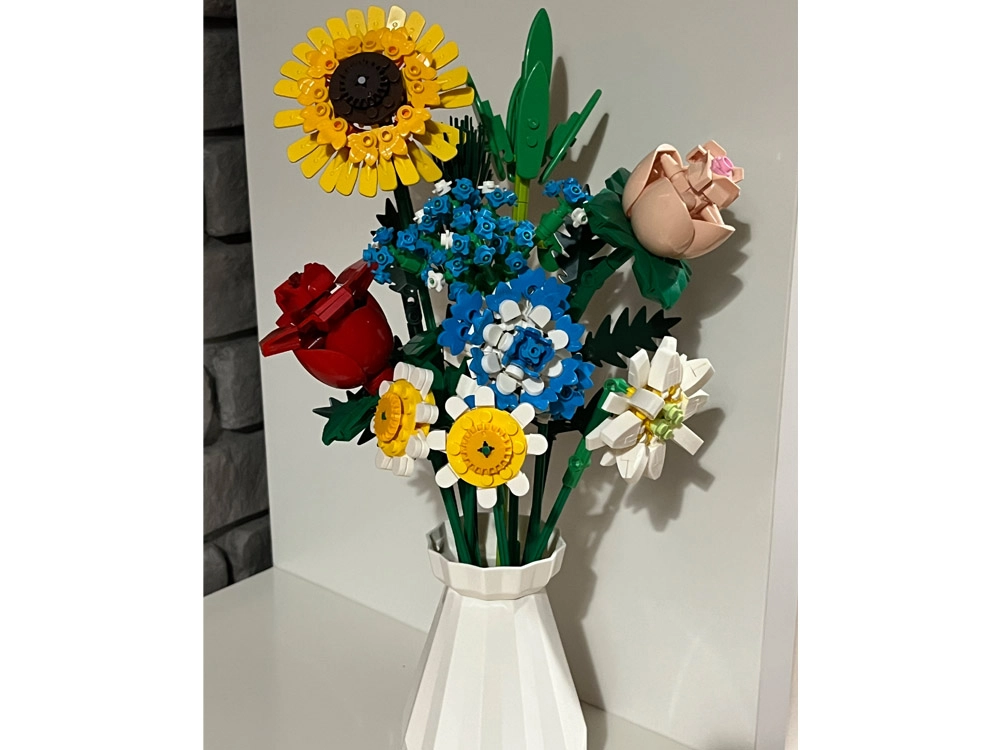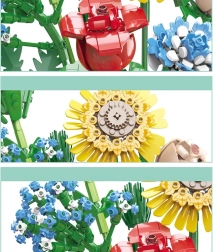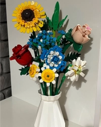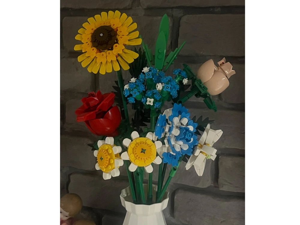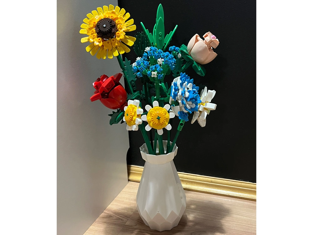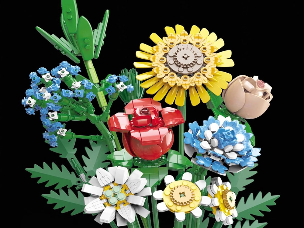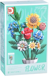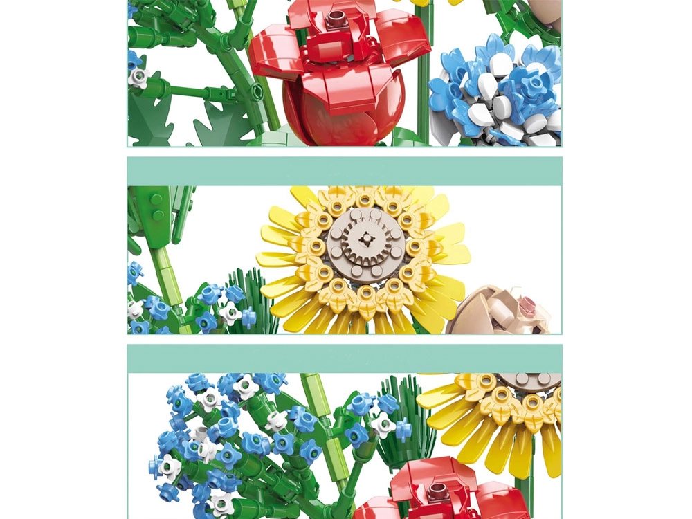 Превърнете конструктора в дизайнерска декорация. Пъстрият букет от строителни елементи включва слънчоглед, рози, карамфил, маргаритка, лилия, незабравка и зелени допълнения (листa хайтонг, кедър, трева). Част от комплекта е и елегантен кремав флакон, така че готовият букет можете веднага да изложите на рафт или маса.