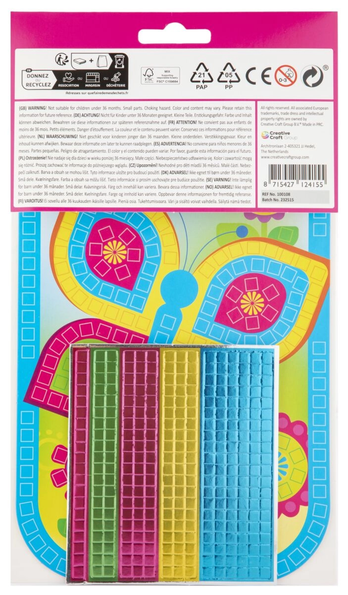 Създайте блестяща картина на пеперуда благодарение на простия принцип на мозайка по цветове. Върху включения шаблон залепвате метални самозалепващи се EVA квадратчета и стъпка по стъпка се получава красив мотив в размер A5. Страхотно забавление за деца и начинаещи, което подпомага развитието на фината моторика и концентрацията.