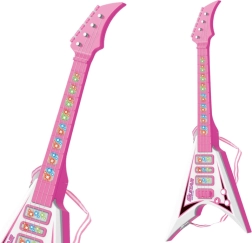 Забавна детска електрическа китара в розов цвят с светлинни ефекти, предварително записани мелодии и рамо презрамка за удобно свирене в изправено положение. Лекият дизайн и размерите, подходящи за малки ръце, подпомагат креативността, ритъма и първите стъпки в света на музиката.