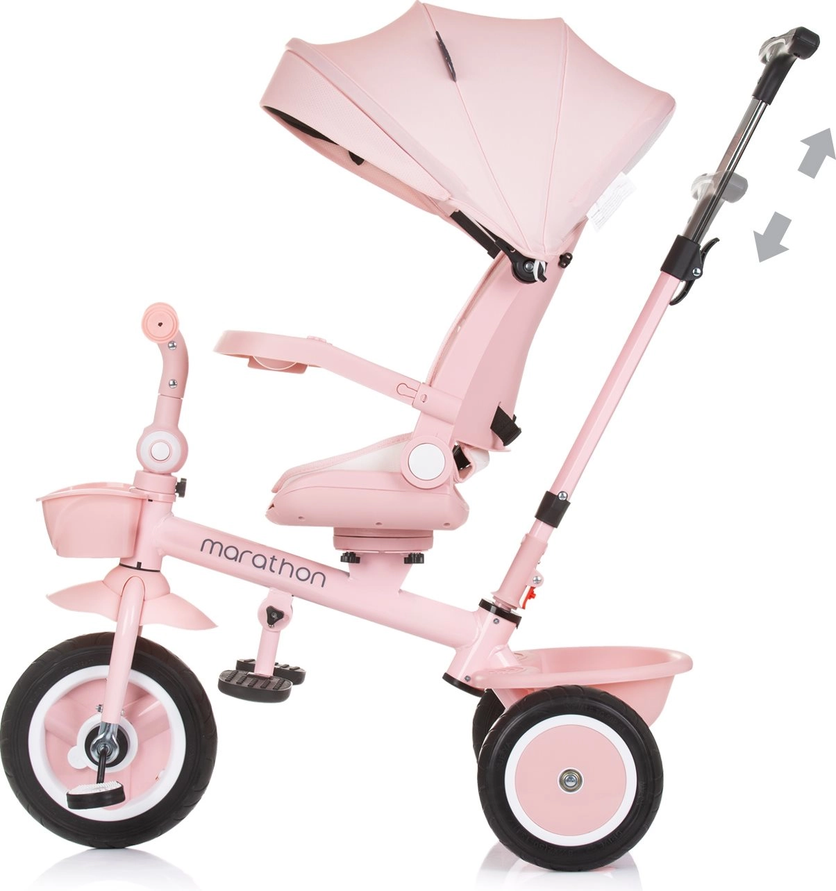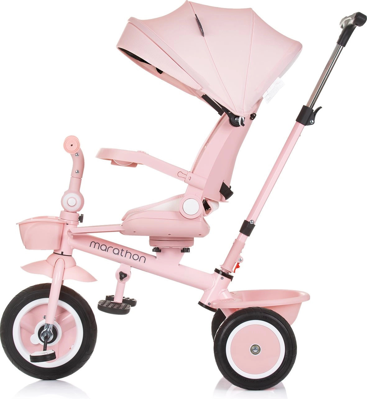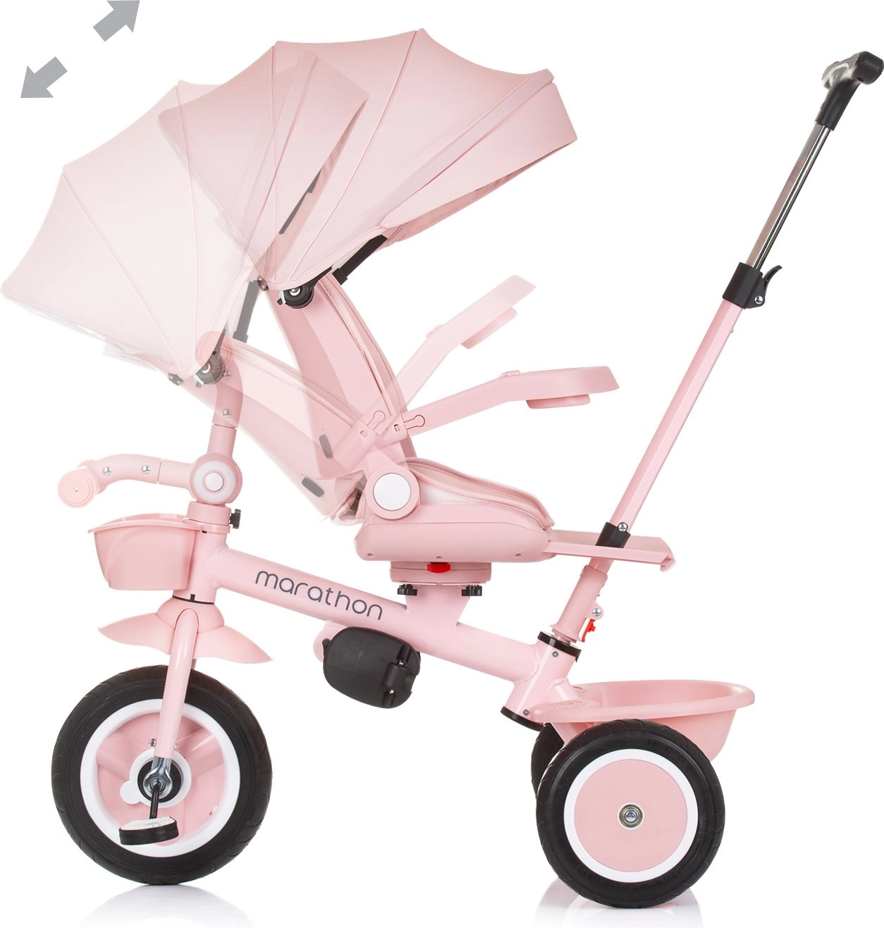 Триколката с сенник Marathon 2в1 Flamingo е проектирана да осигурява максимален комфорт и безопасност както за децата, така и за родителите благодарение на своите вариативни възможности. Първоначално родителите могат да управляват триколката чрез удобна дръжка с еко кожа, а когато детето достатъчно порасне, може да кара самостоятелно.