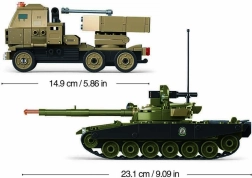 Дължината на танка е 23,1 cm, а на превозното средство 14,9 cm. Комплектът е интуитивно проектиран и лесното сглобяване подпомага детската самостоятелност. Размерите на опаковката са 47,5x33x6,7 cm, което го прави подходящ подарък, впечатляващ с интересен дизайн.