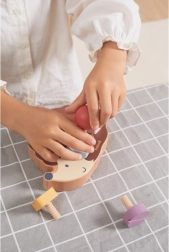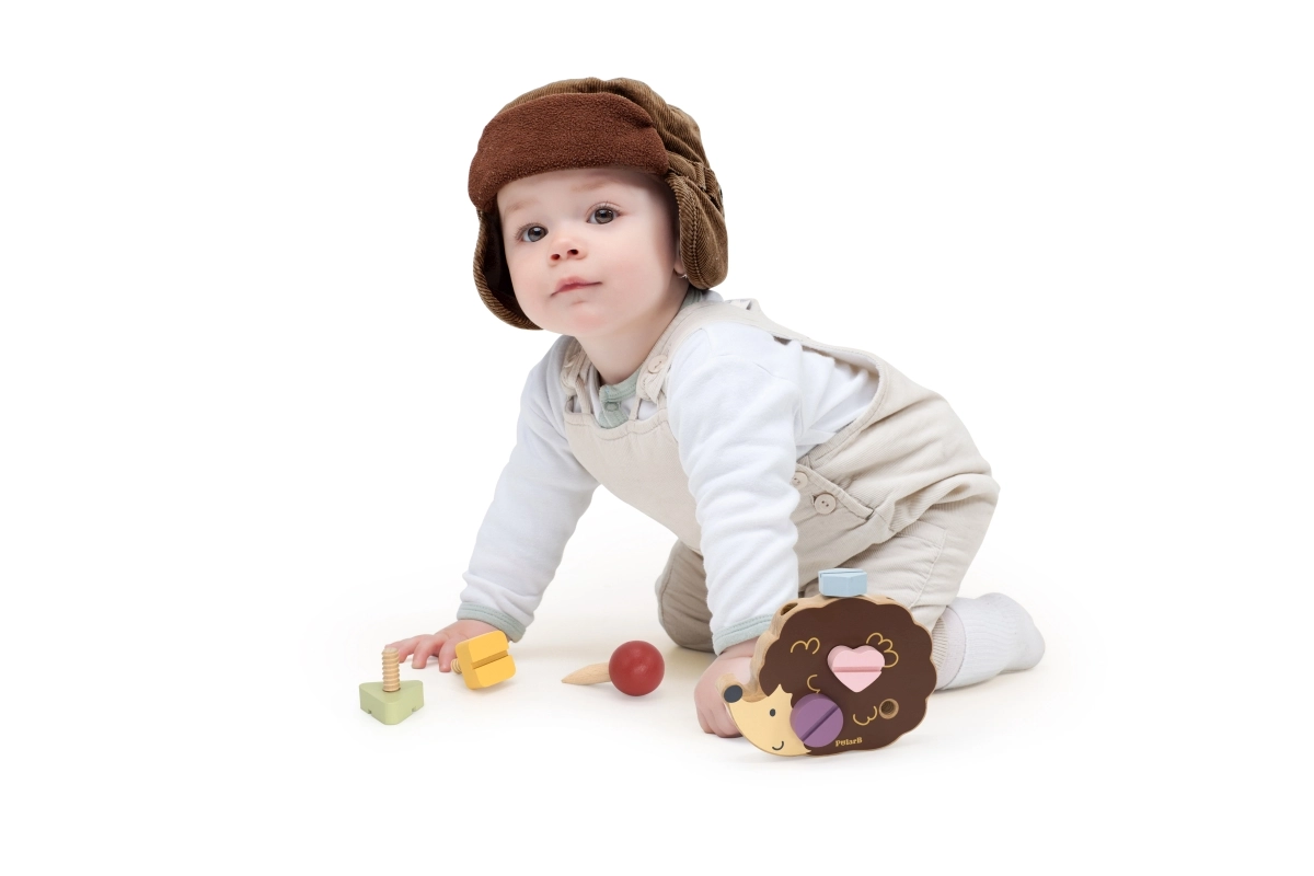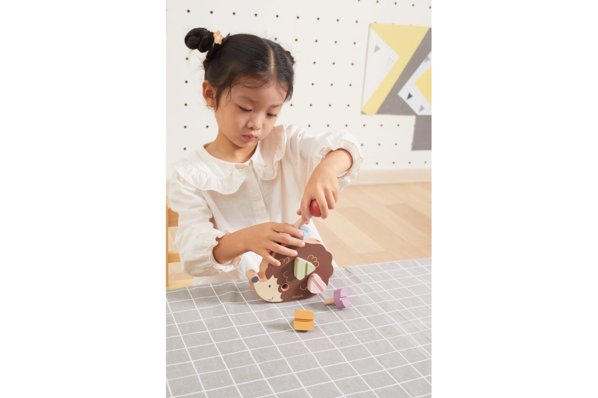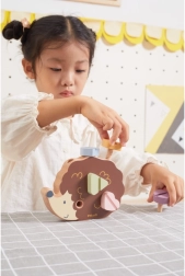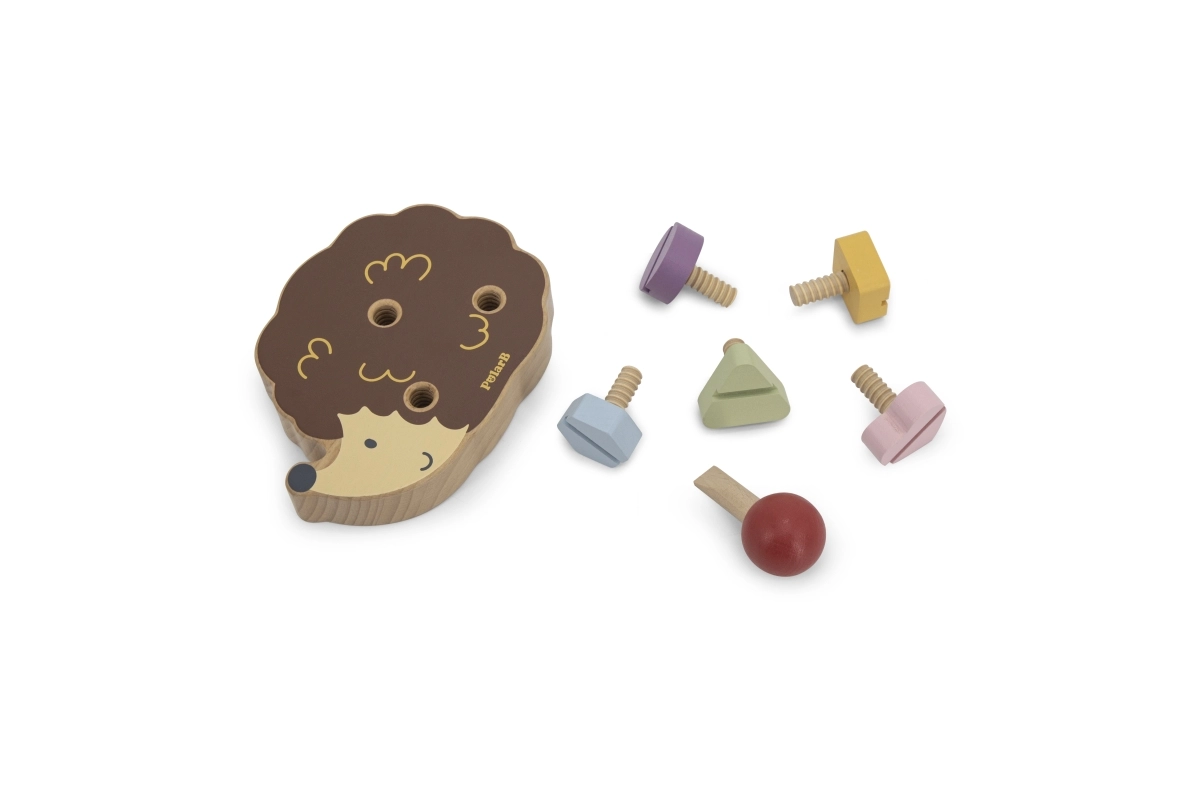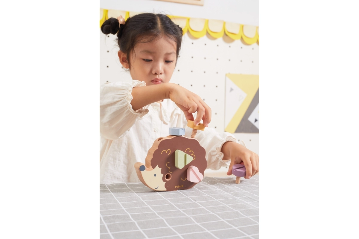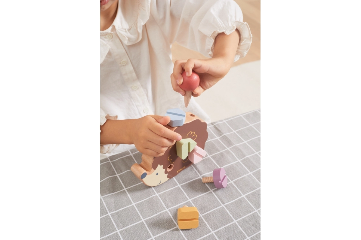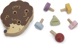 Дървеният таралеж позволява на децата да тренират фината моторика с помощта на винтове в различни цветове и форми.