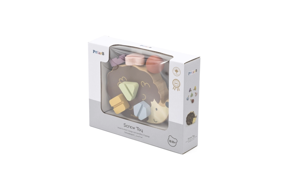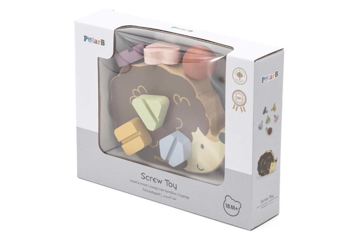 VIGA PolarB Дървена играчка Таралеж със винтове предлага уникална комбинация от играчка и учебно средство. Красиво изработеният таралеж позволява на децата да тренират своите моторни умения с помощта на пет цветни винта с различни форми. Всеки винт може лесно да се завинтва в таралежа със специална отвертка, която е включена в комплекта.