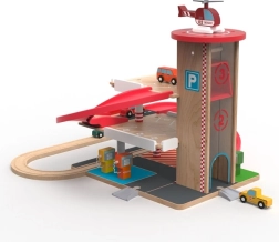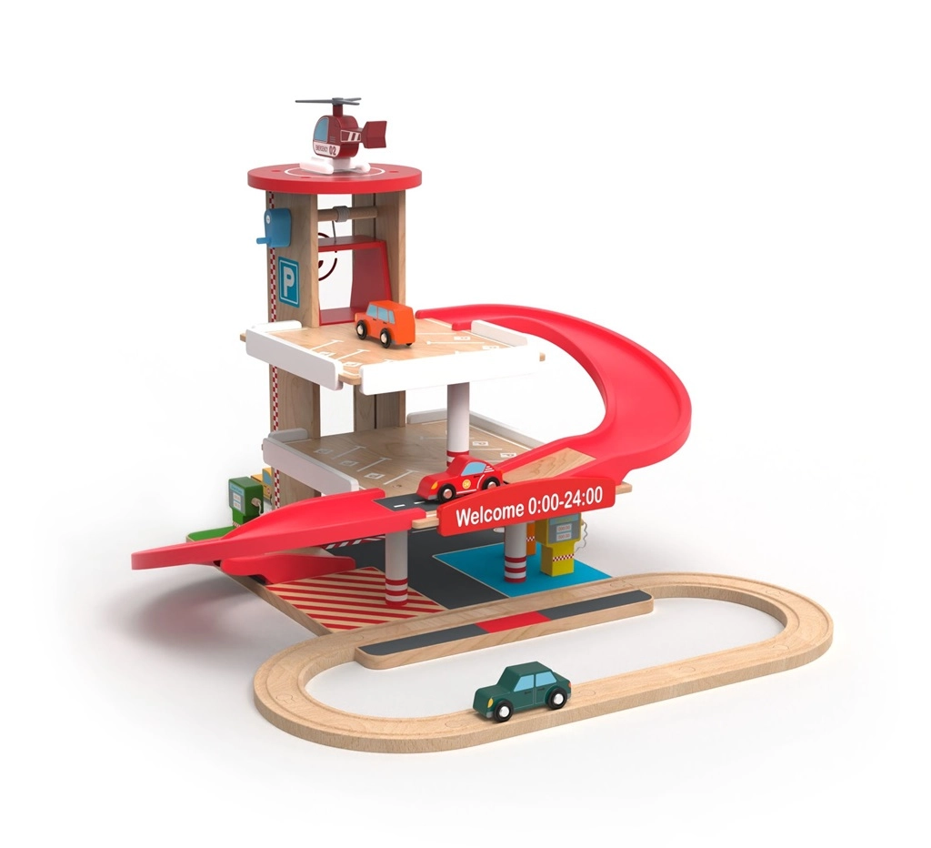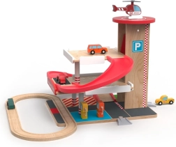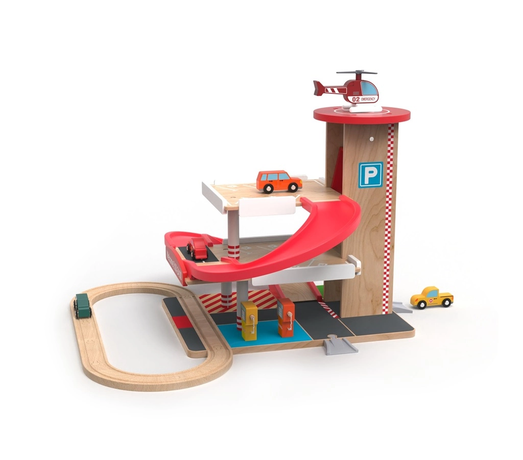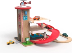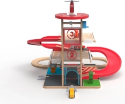 Този качествен дървен гараж с влакова писта предлага три нива за паркиране, функционален асансьор с манивела и хелипорт на покрива. Децата могат да заредят на колонките на приземния етаж, да издигнат количката с асансьора и да я пуснат по червената спираловидна рампа обратно надолу, където плавно да продължат по релсите. Издръжливите материали и обмислените детайли гарантират дълъг живот и безопасна игра.