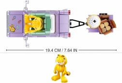 Сглобете лилава кола с детайл „Garfield“ отстрани и прикачете ремарке с тематични аксесоари – идеално за игра и за изложение.