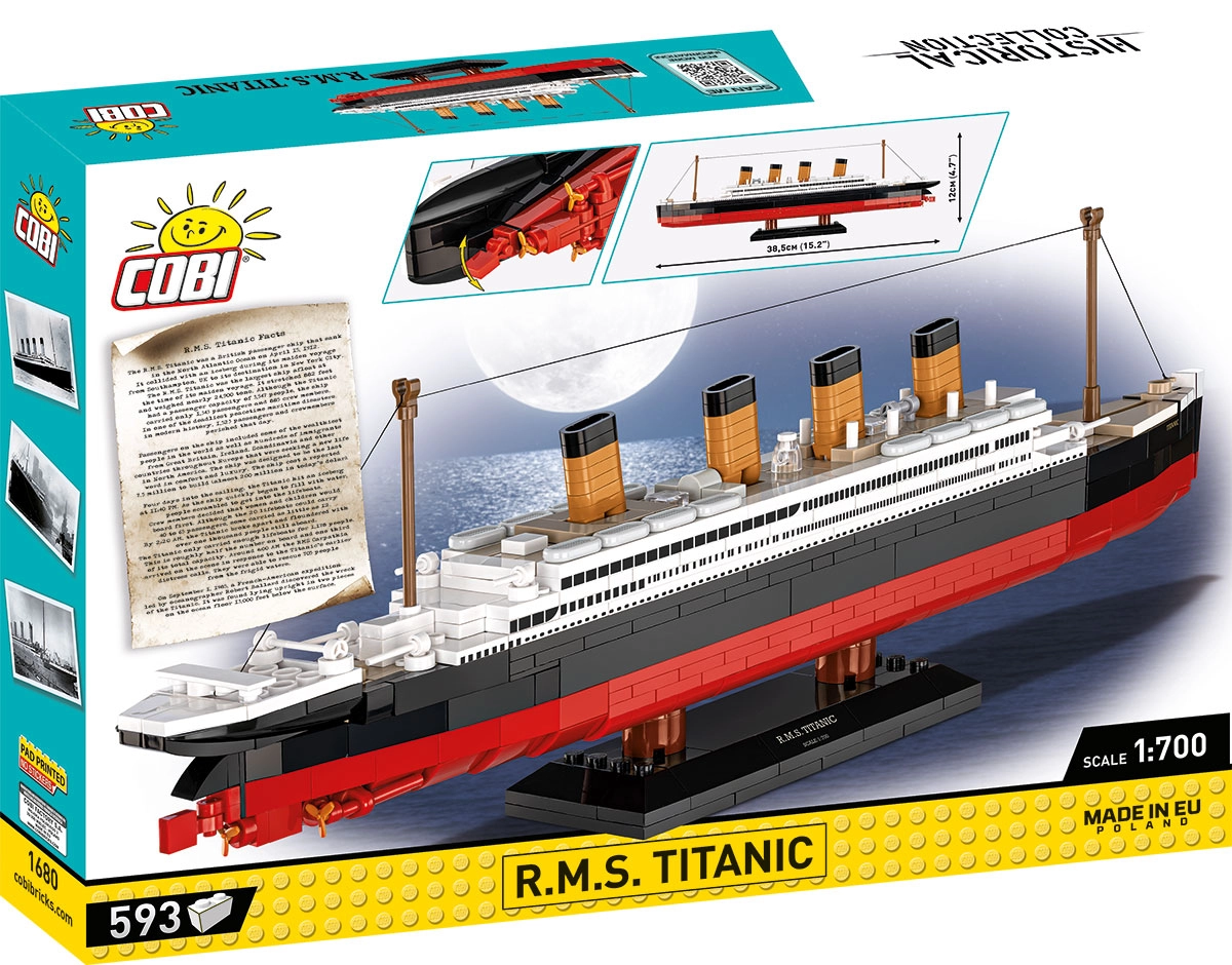 Сглобяването е лесно и забавно благодарение на интуитивната илюстрована инструкция. Комплектът е произведен в ЕС, съвместим е с други марки блокчета и е подходящ за строители от 7 години. Включена е също стойка с името на кораба, благодарение на която „Титаник“ ще се превърне в ефектна украса за рафт, работно място или детска стая.