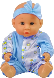 Сладка кукла бебе в син тоалет с лента за коса и панделка носи часове забавление и учене. Благодарение на функцията пие и пишка децата изпробват грижата за бебе, развиват фината моторика, емпатия и отговорност. В комплекта има шишенце и гърне, куклата има подвижни ръце, крака и главичка и изглежда много реалистично.