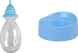 Пълно оборудване за грижа за куклата: прозрачно шишенце и синьо гърне за упражняване на хигиенни навици и забавни сценки.