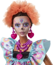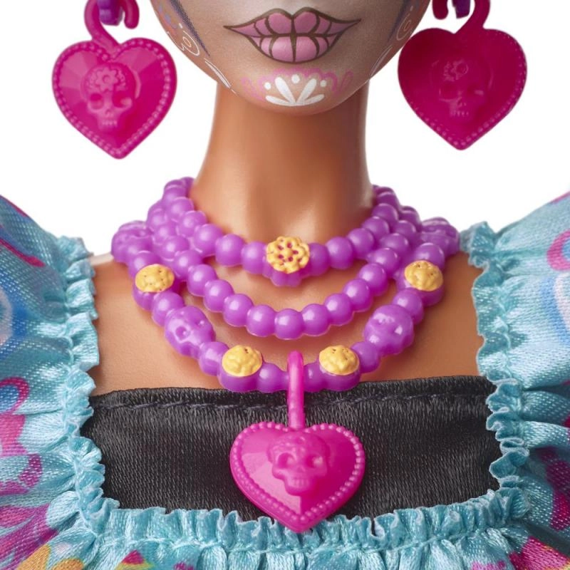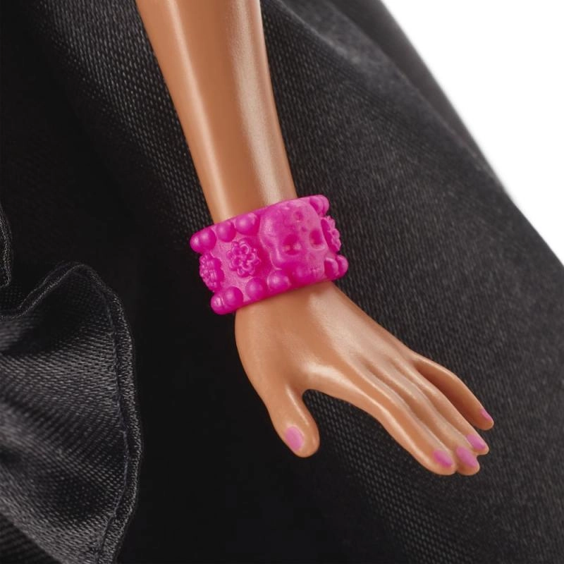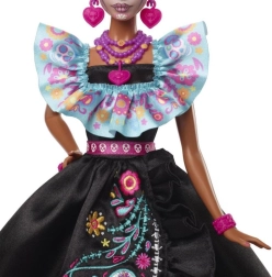 Barbie продължава своята серия Dia de Muertos със стилизиран, богато украсен тоалет, който отдава почит на традициите.