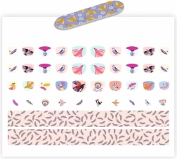 - Съдържание на комплекта: 30 стикера за нокти, 10 по-малки стикера, 1 лента с мотиви за изрязване, 1 пила за нокти.