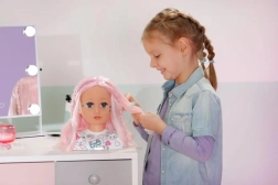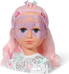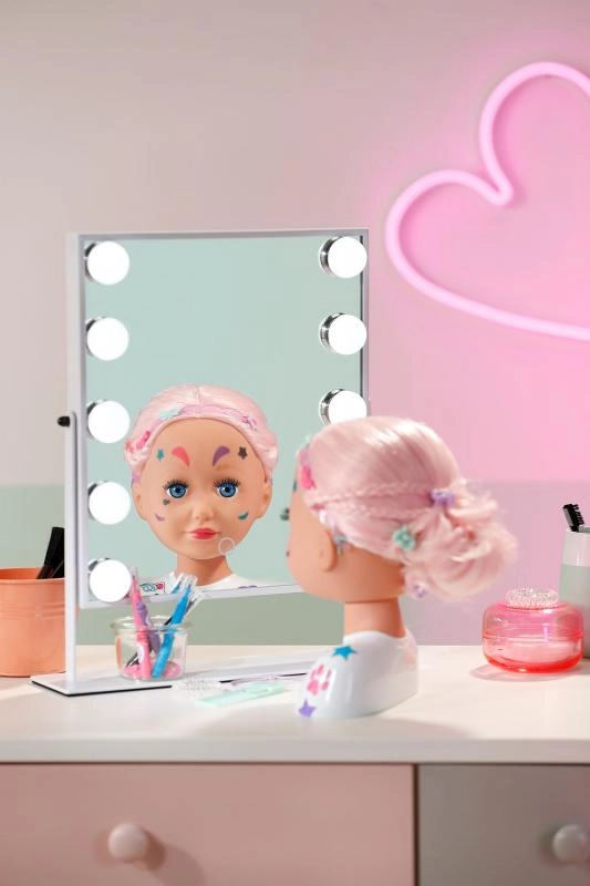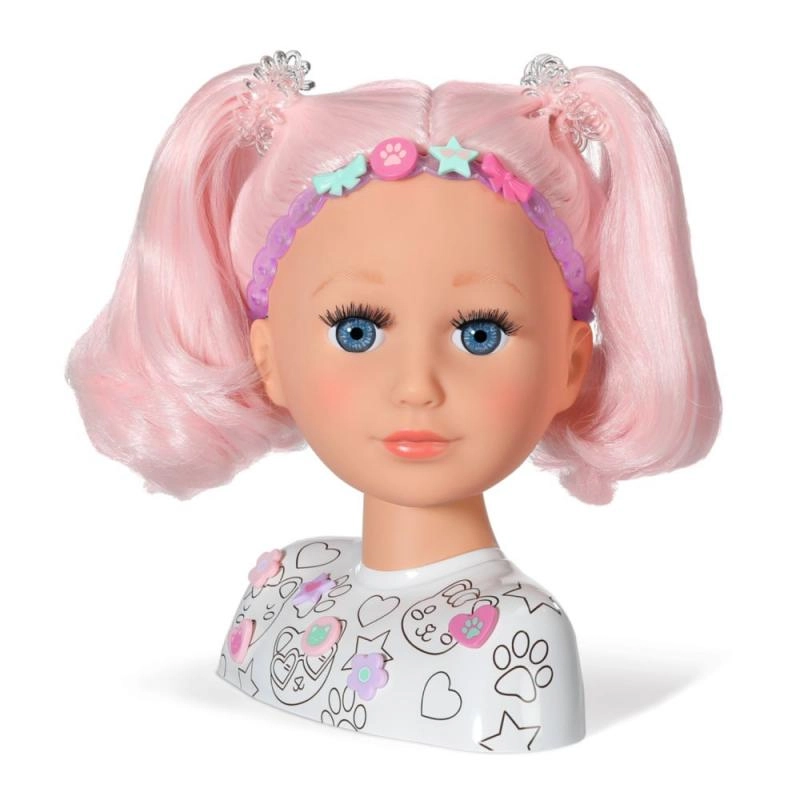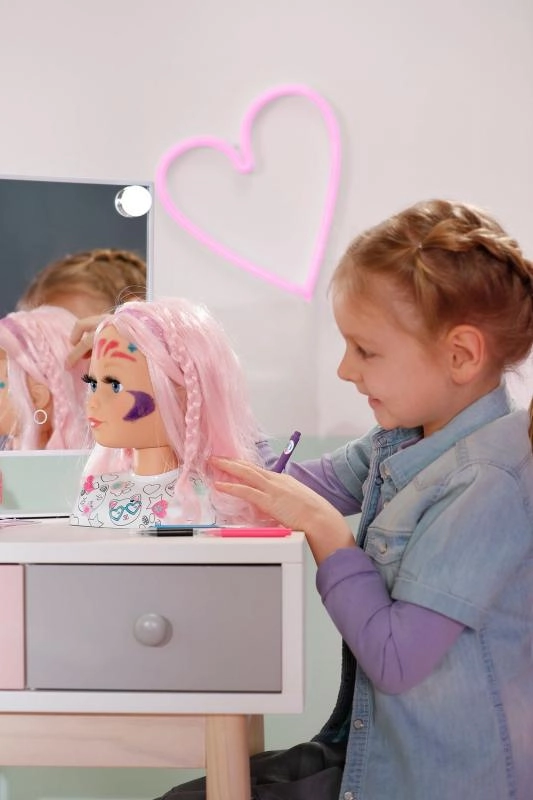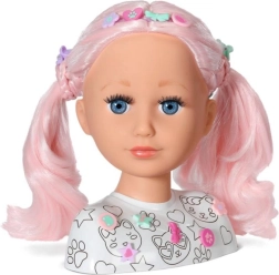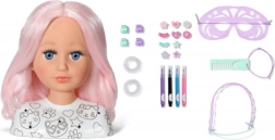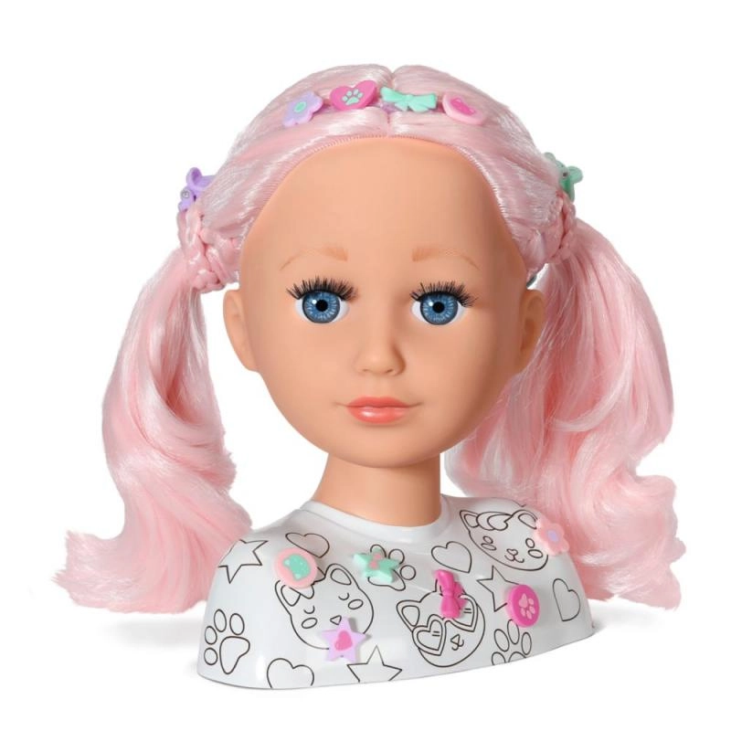 Тази креативна глава за сресване е идеална за малки стилистки и гримьорки. Дългата розова коса от висококачествен найлон запазва формата отлично и е перфектна за сресване, плитки и сплитане. С включените маркери и шаблон лесно могат да се създават оригинален грим и забавни мотиви върху лицето.