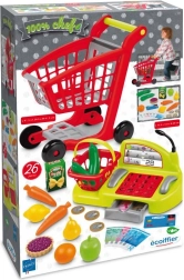 Детският комплект за игра „магазин“ предлага всичко необходимо на малките продавачи: пазарска количка, каса с пари, платежна карта, скенер и микрофон, включително плодови и зеленчукови аксесоари и малка ръчна кошничка. Чудесен за развитие на въображението, социалните умения и моториката.