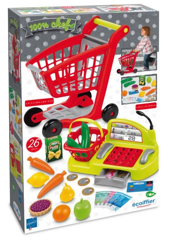 - Пазарска количка и ръчна кошничка за удобно „пазаруване“ като в истински супермаркет.