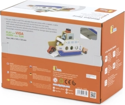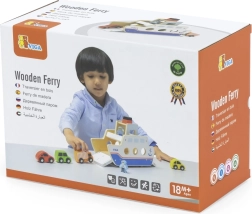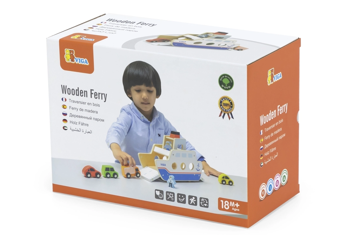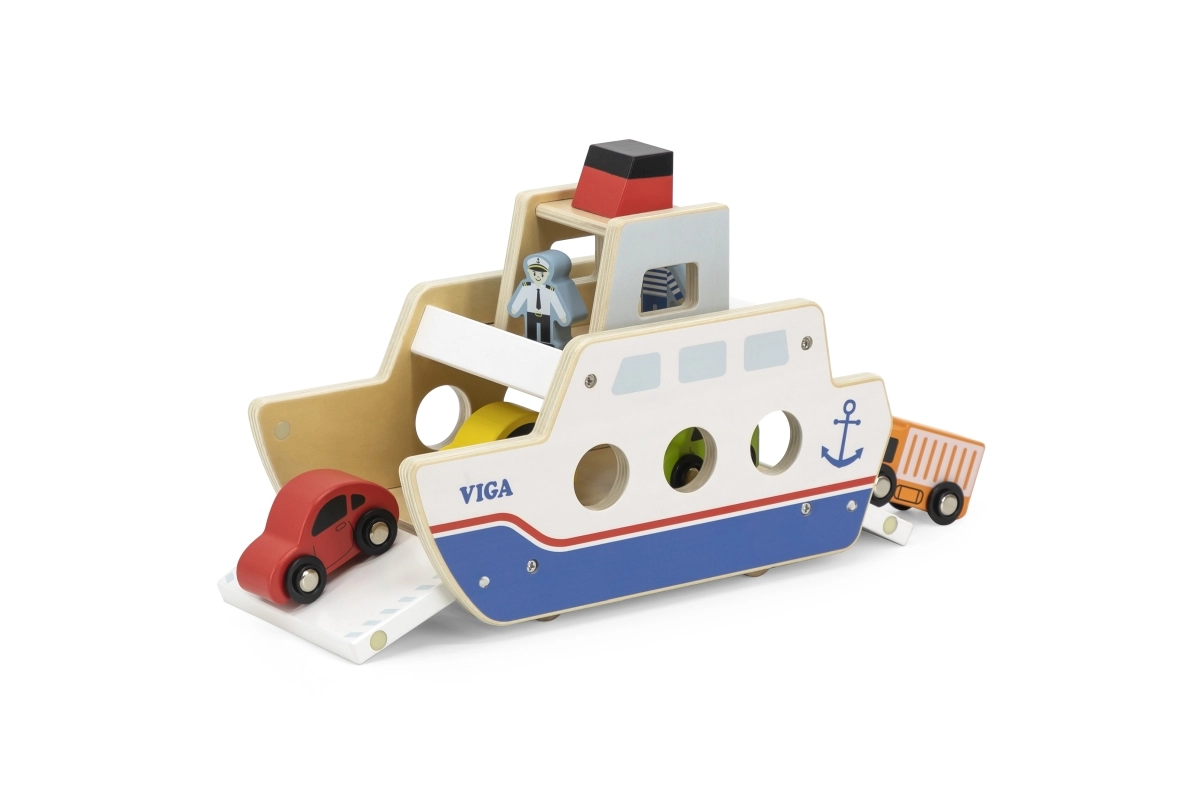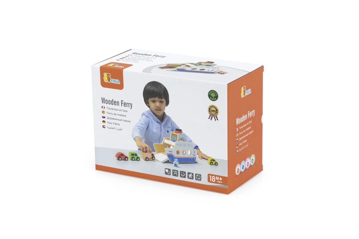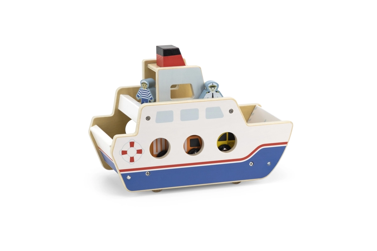 Този качествен дървен ферибот ще зарадва всички малки почитатели на превозни средства и кораби. Корабът се движи на колелца, така че лесно се премества, и има падащи рампи от двете страни, за да могат количките удобно да се качват и слизат. Здравата изработка и гладките ръбове са идеални за деца от 18 месеца.