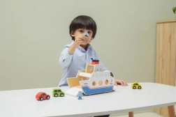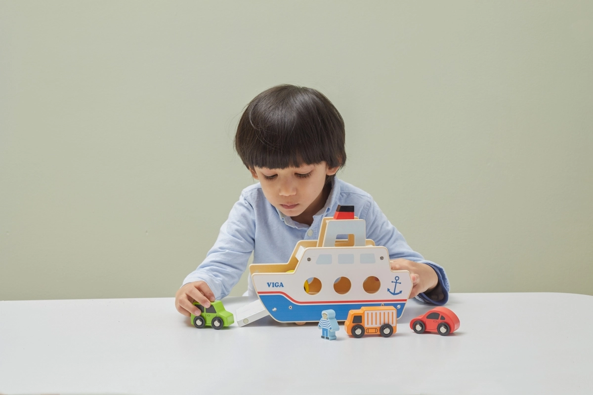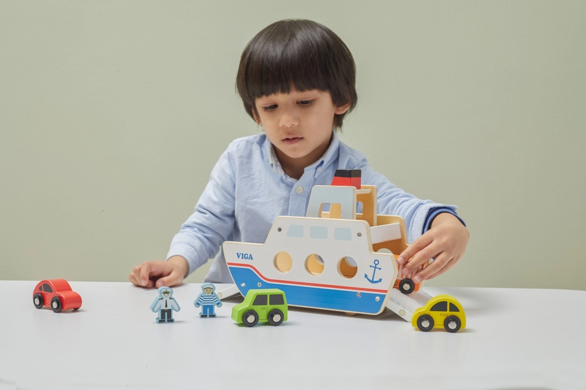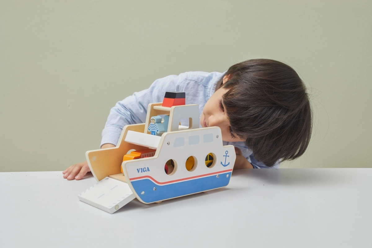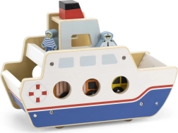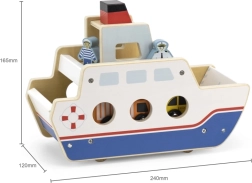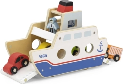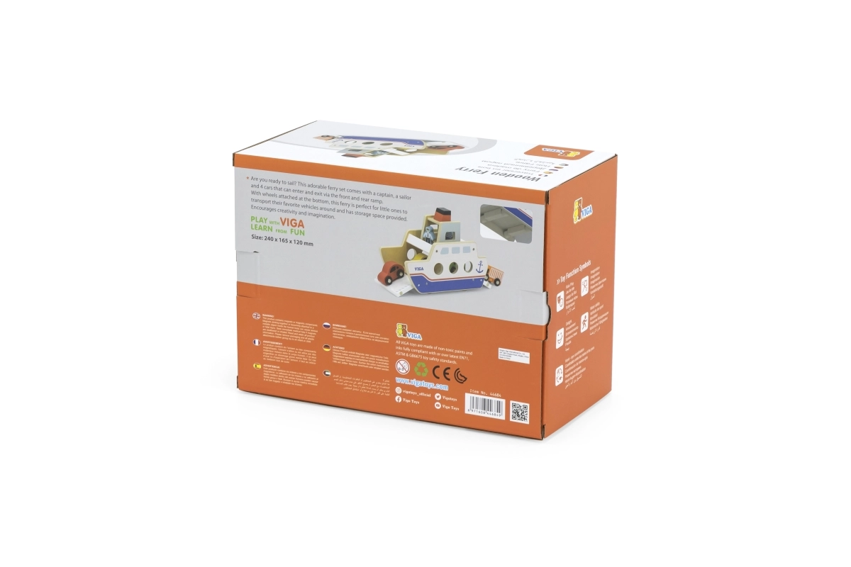 Този качествен дървен ферибот ще зарадва всички малки почитатели на превозни средства и кораби. Корабът се движи на колелца, така че лесно се премества, и има падащи рампи от двете страни, за да могат количките удобно да се качват и слизат. Здравата изработка и гладките ръбове са идеални за деца от 18 месеца.