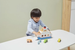 Част от комплекта са 4 колички със свободно движение (около 6,5 cm) и 2 дървени фигурки (около 4 cm), които обогатяват игровите сценарии и подпомагат развитието на моториката, координацията и въображението. Благодарение на компактните размери играчката е чудесна и за път.