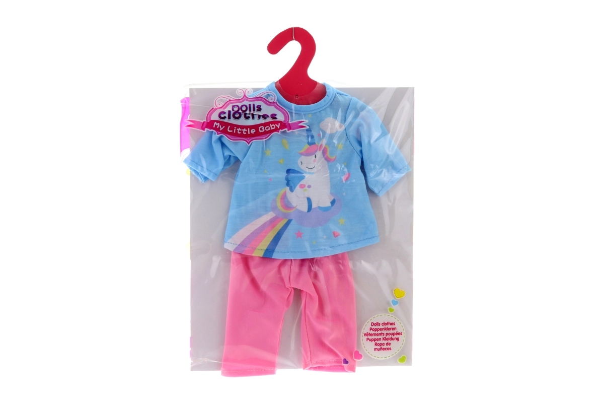 Очарователен комплект дрешки за кукли с размер 35–45 см, който ще зарадва всяка малка дизайнерка. Комплектът включва удобни долнище тип анцуг и тениска с мотив на еднорог. Дрешките се обличат лесно, идеални са за детска игра на грижи и развитие на фината моторика. Подходящо за деца от 3 години.