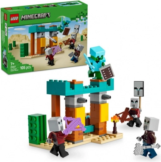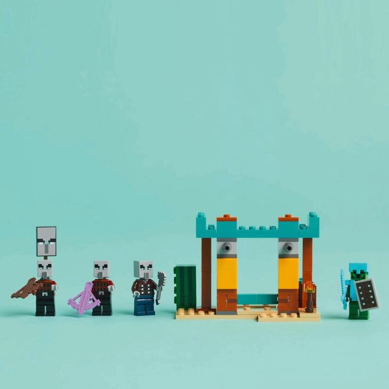 Отправете се към безводната пустиня и защитете аванпоста от трима иладжъри! Превърнете се в кактусов рицар с диамантена броня и се насладете на екшън с реалистични аксесоари от играта Minecraft. Благодарение на функционалните снаряди, изстрелвани с пръсти, и забавните елементи този по-малък сет е чудесен избор както за бърза, така и за продължителна игра.