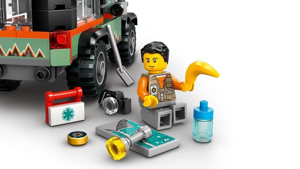 В комплекта има минифигурка авантюрист и реалистични допълнения: фотоапарат, бутилка за вода, фенер, карта, компас, бинокъл, инструменти и аптечка – всичко за автентични истории сред природата. Сглобяването се улеснява от печатни инструкции и приложението LEGO Builder с 3D изглед и проследяване на напредъка.