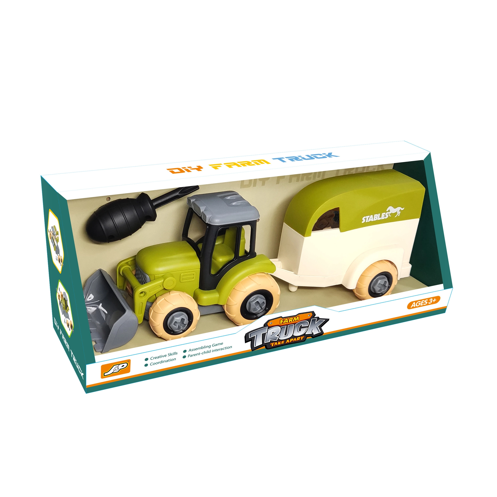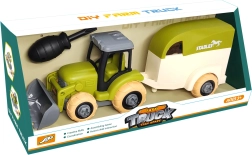 Забавен конструктор за малки фермери: винтов трактор с ремарке за коне и детска отвертка, който подпомага фината моторика, техническите умения и креативното мислене. Здрава пластмасова изработка, възможност за разглобяване и сглобяване, включен е и конче за още по-реалистична игра.