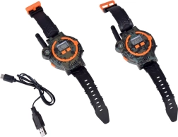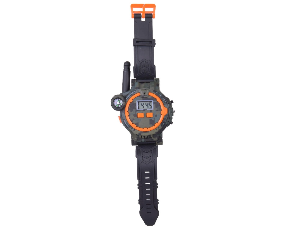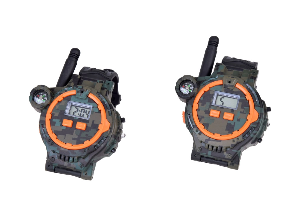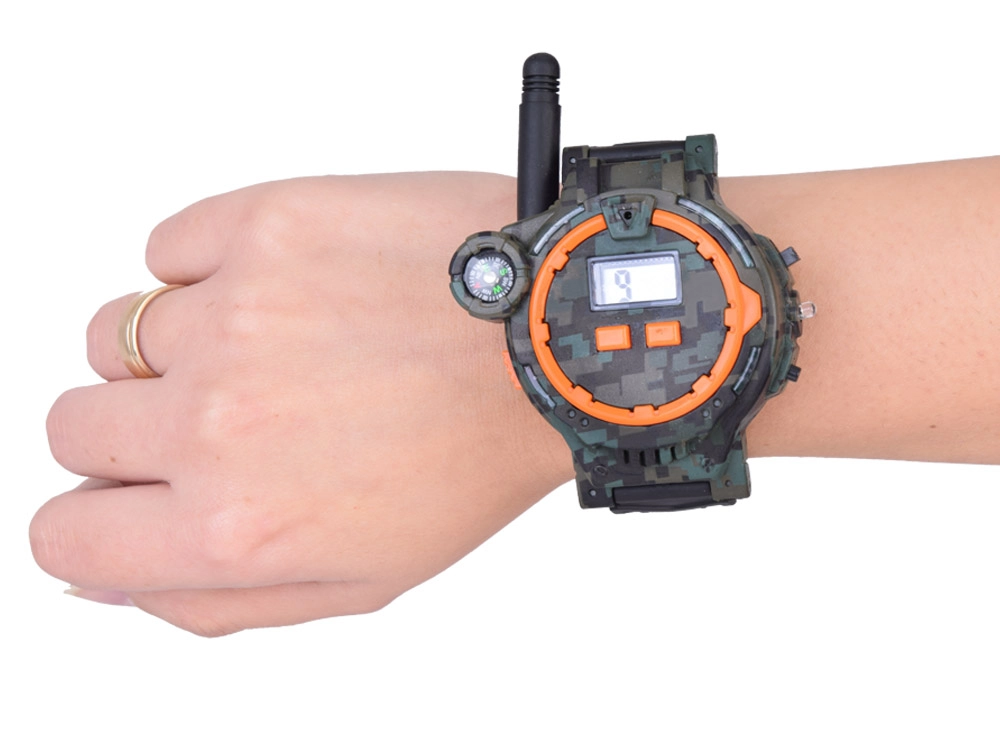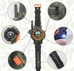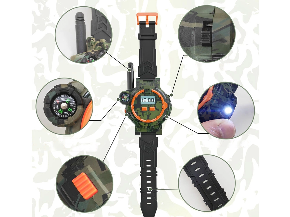 Тези многофункционални часовници в военен стил позволяват на децата да комуникират на разстояние до 200 метра благодарение на вграденото уоки-токи. Перфектно допълнение за игри на открито с приятели, часовниците впечатляват с качествена пластмасово-каучукова изработка в камуфлаж с черна каишка.
