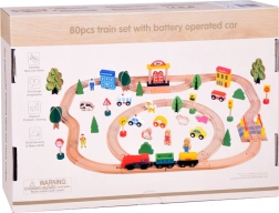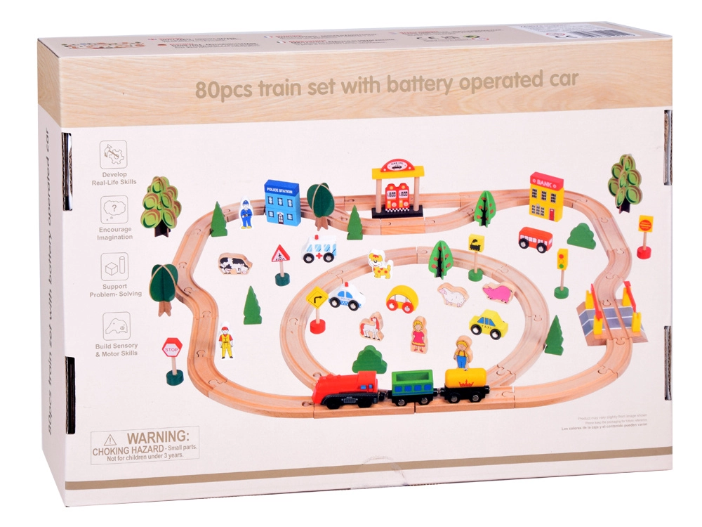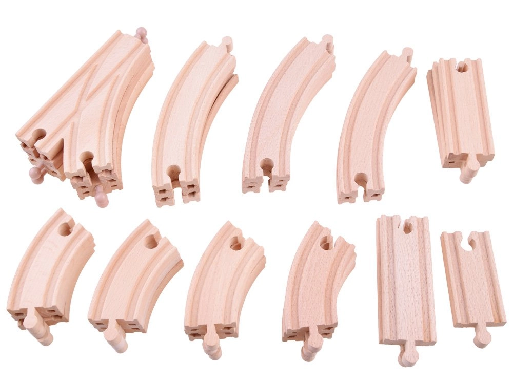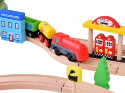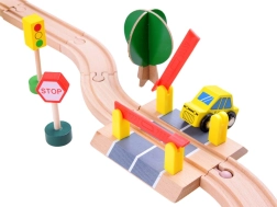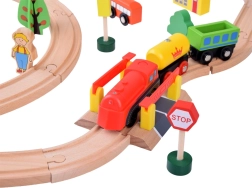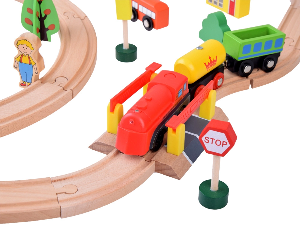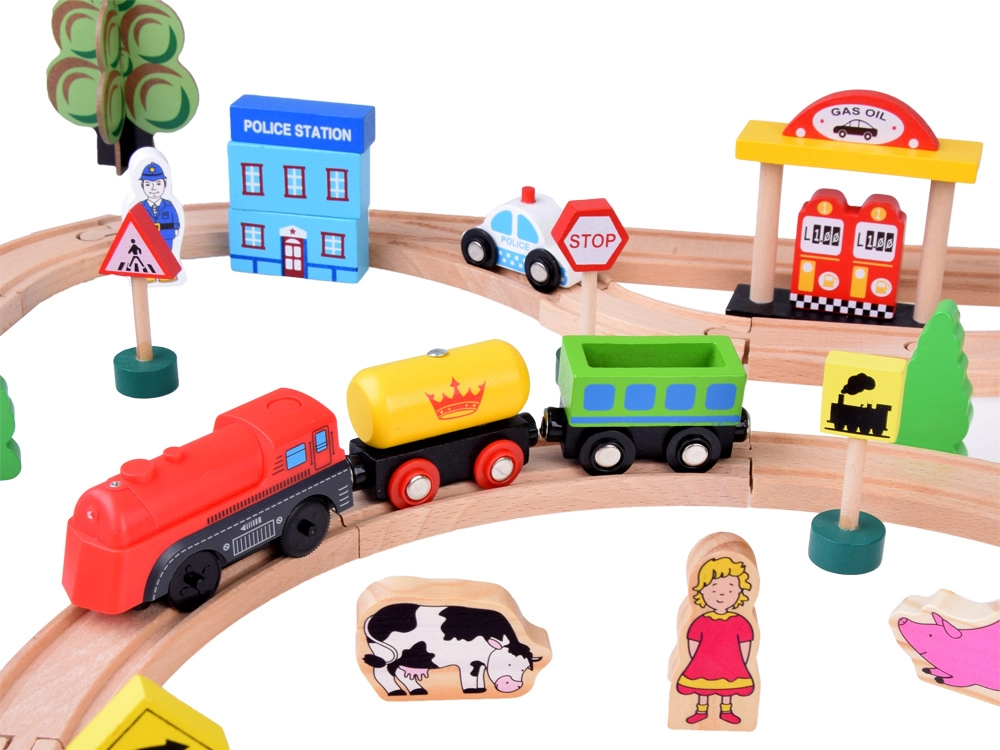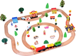 Този удивителен комплект дървена влакова писта е идеален за развитие на детското въображение и фината моторика. Съдържа:
