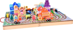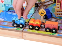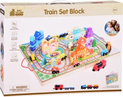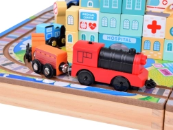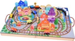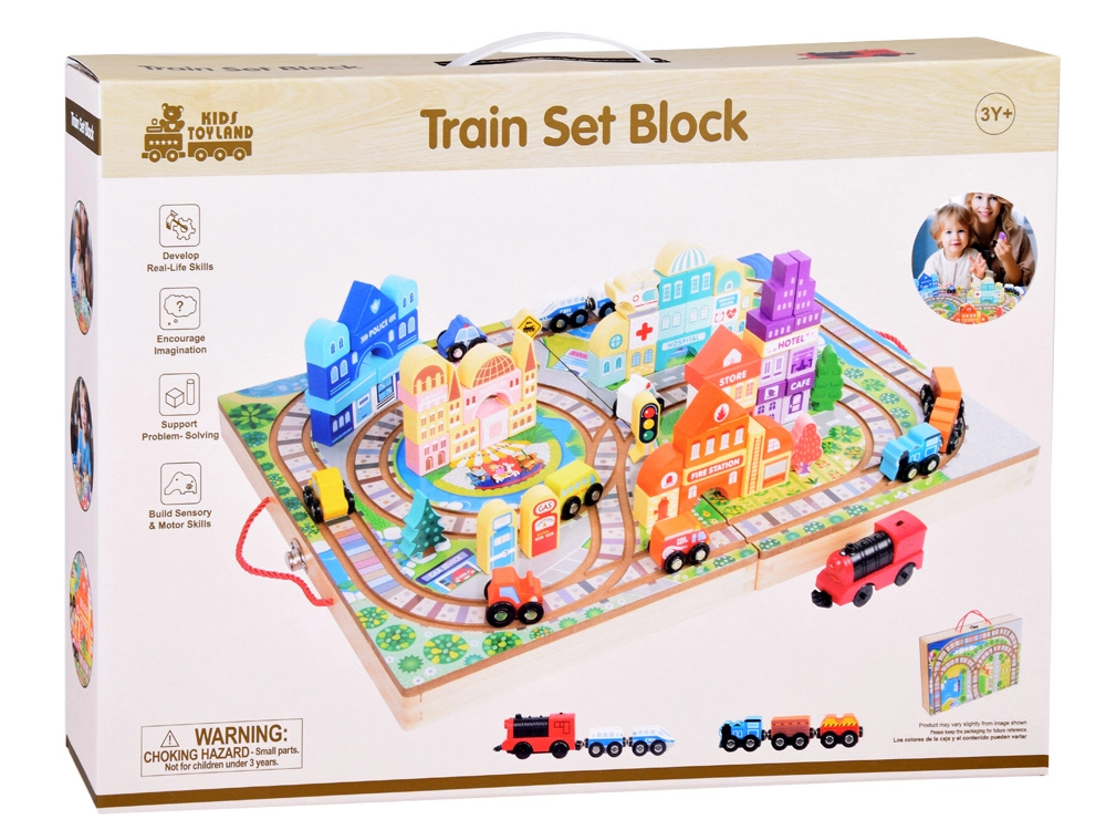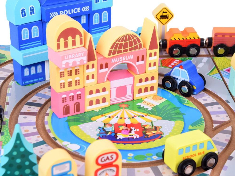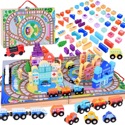 Открийте завладяващия свят на дървените строежи с този дървен градски комплект, който носи 89 елемента забавление. Комплектът включва релси, батерийни влакчета и различни цветни блокове за изграждане на уникални сгради.