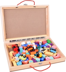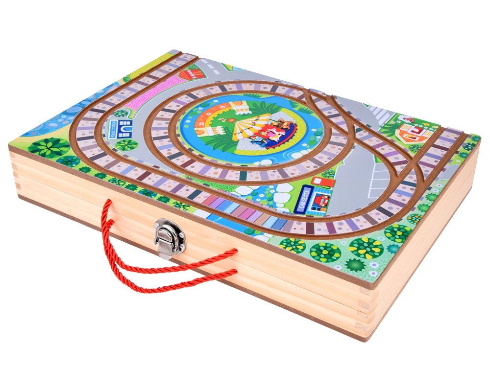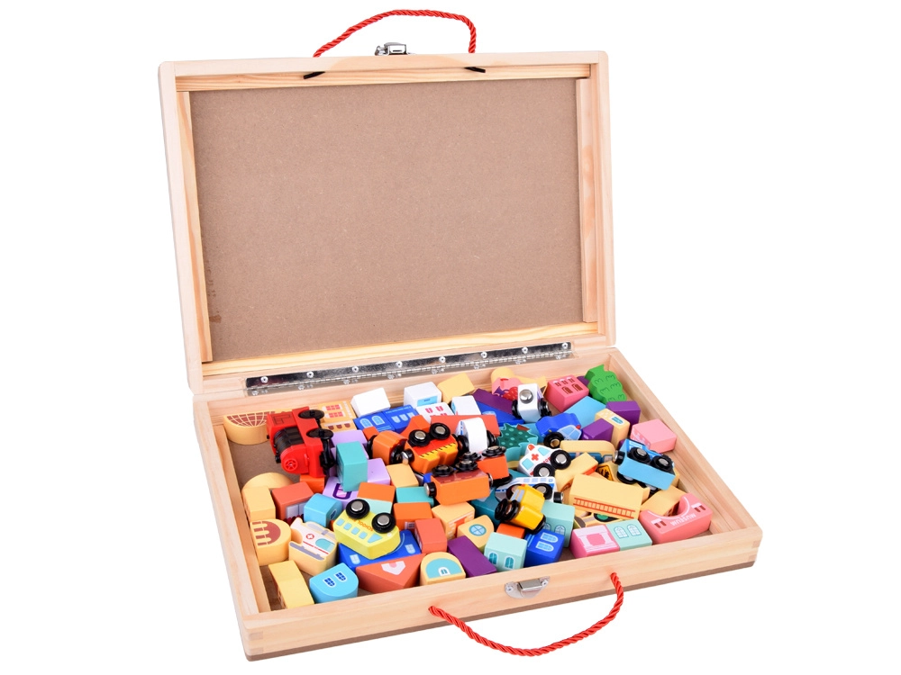 Съдържа леко дървено куфарче за лесно пренасяне и съхранение, в което могат да се приберат всички строителни елементи.