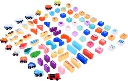 Включва различни цветни дървени блокчета за построяване на град, които насърчават креативността и осъзнатото конструиране.