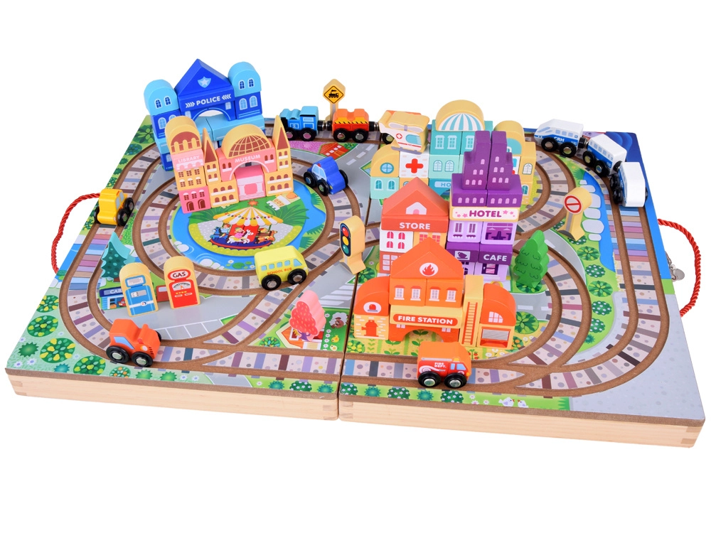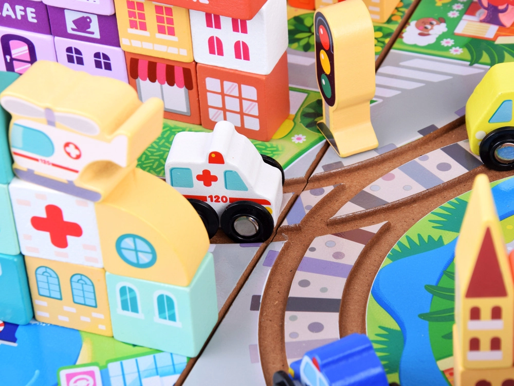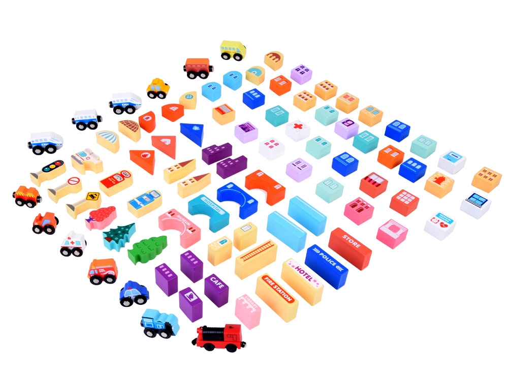 - Градски блокове: Различни дървени блокчета, които могат да се комбинират и строят в различни конфигурации.