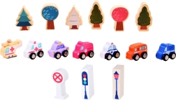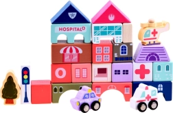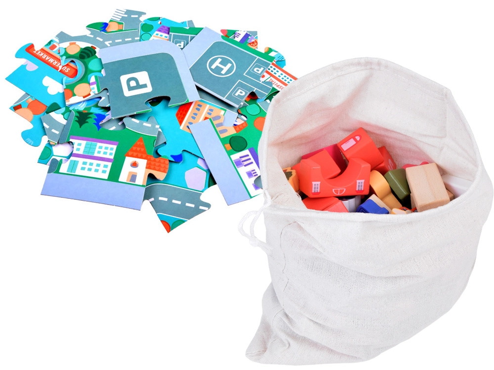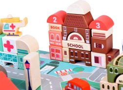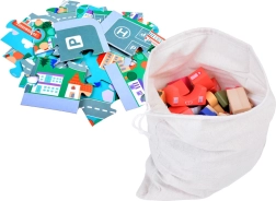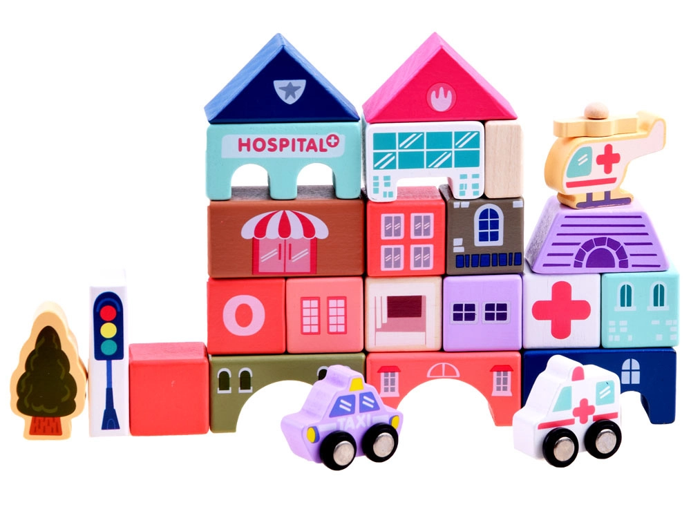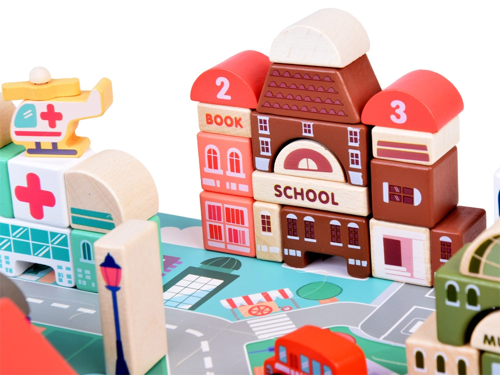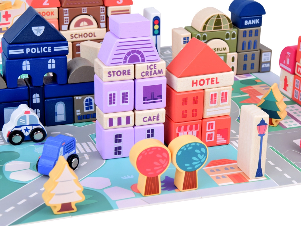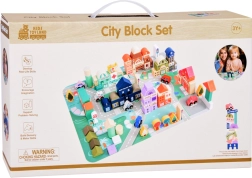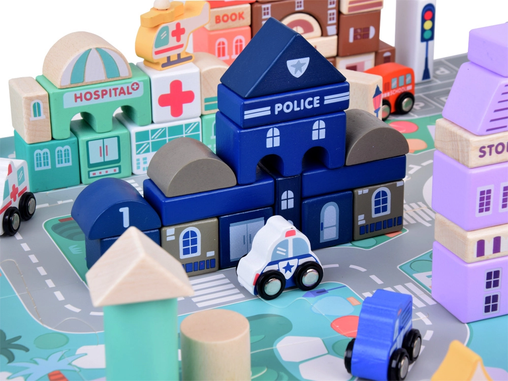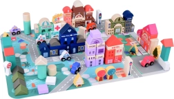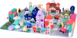 Този пастелен комплект съдържа 115 разнообразни дървени елемента, включително сгради, превозни средства, дървета и пътни знаци. Децата могат да построят собствен град с училище, болница, банка и полицейски участък. С този строителен комплект те не само развиват въображението си, но и моторните умения.