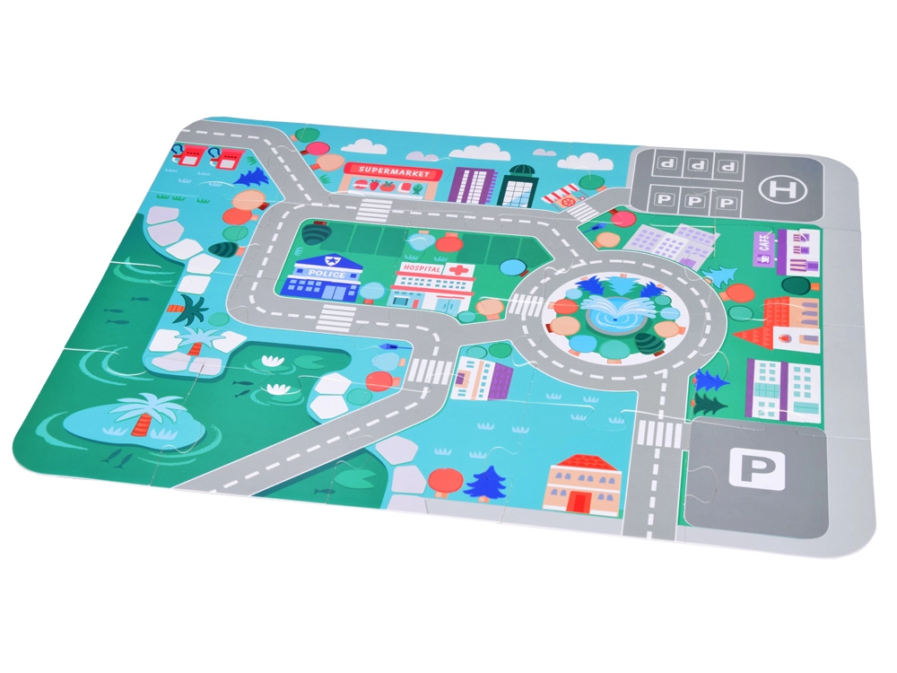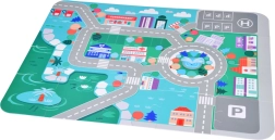 Подложката изобразява градски пейзаж с обозначени пътища и паркинги, което насърчава децата към образователна игра с превозни средства.