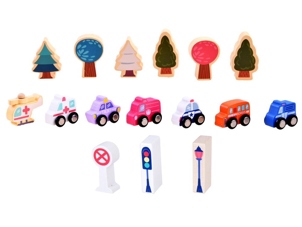Част от комплекта е и игрална подложка с градски мотив, която служи като основа за игрови сценарии. Подложката има обозначени улици, където децата поставят превозни средства като такси, линейка или пожарна кола, с което се запознават с пътни ситуации и знаци.