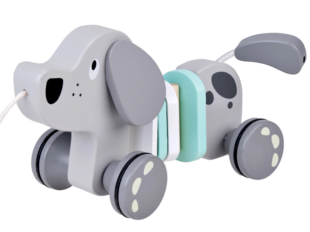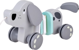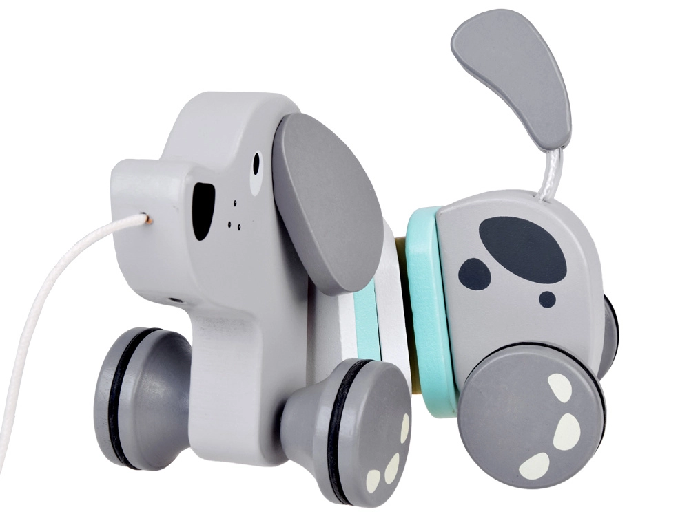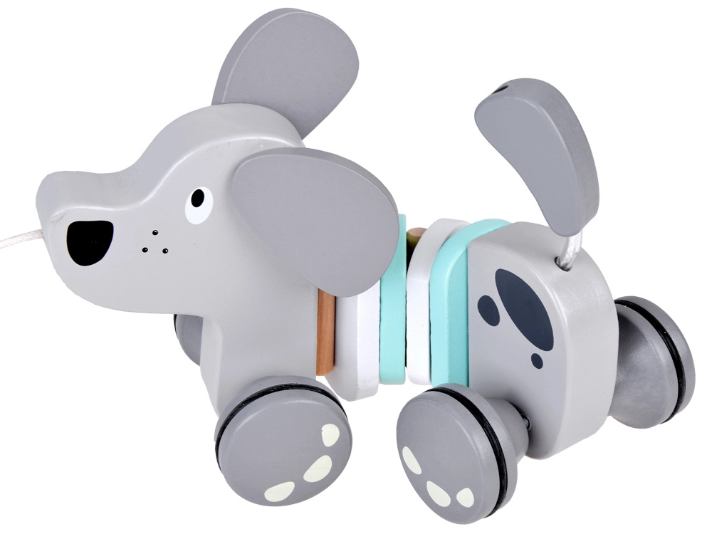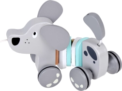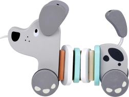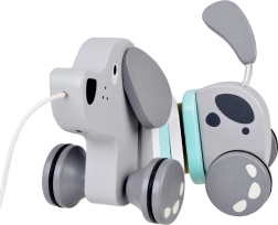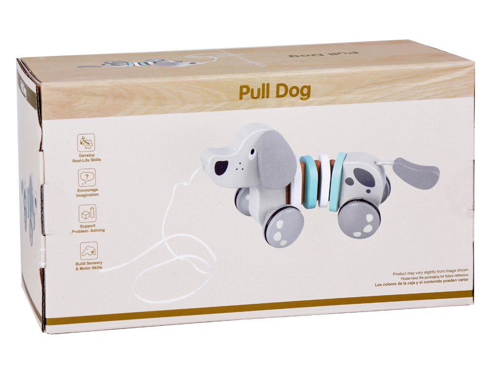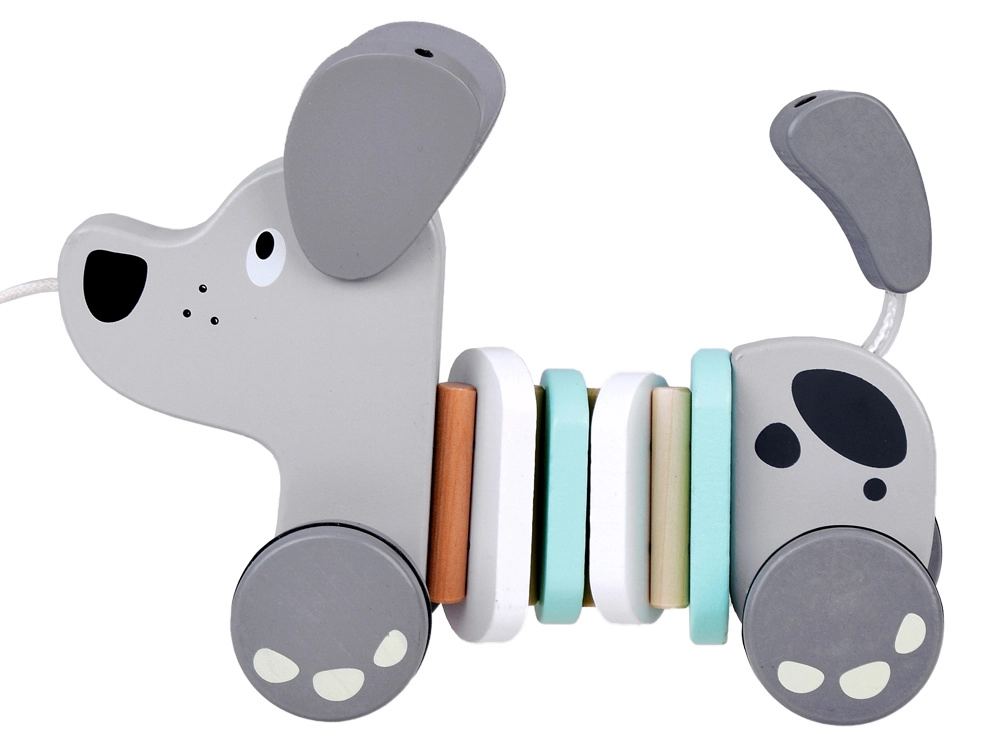 Дървеното кученце има подвижни ушички и опашка, което придава динамика на играта.