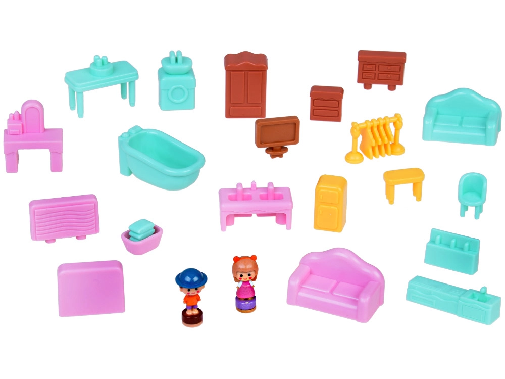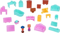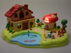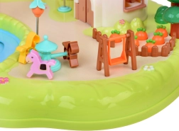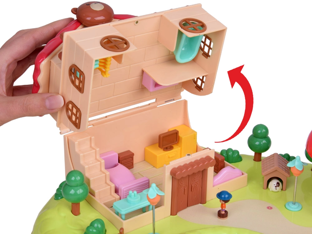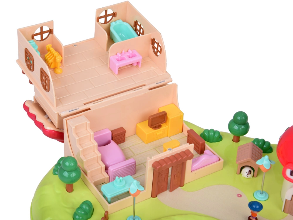 Спалня с отварящ се гардероб, баня с вана и пералня, кухня с хладилник и стая с тоалетка. Навън ви очаква площадка с въртележка и люлка, както и магазинче във форма на гъба.