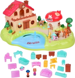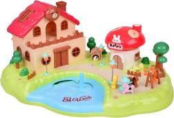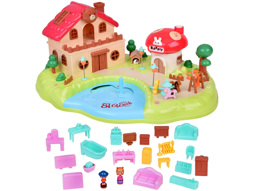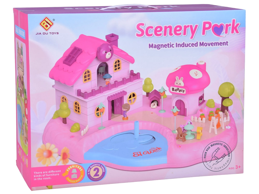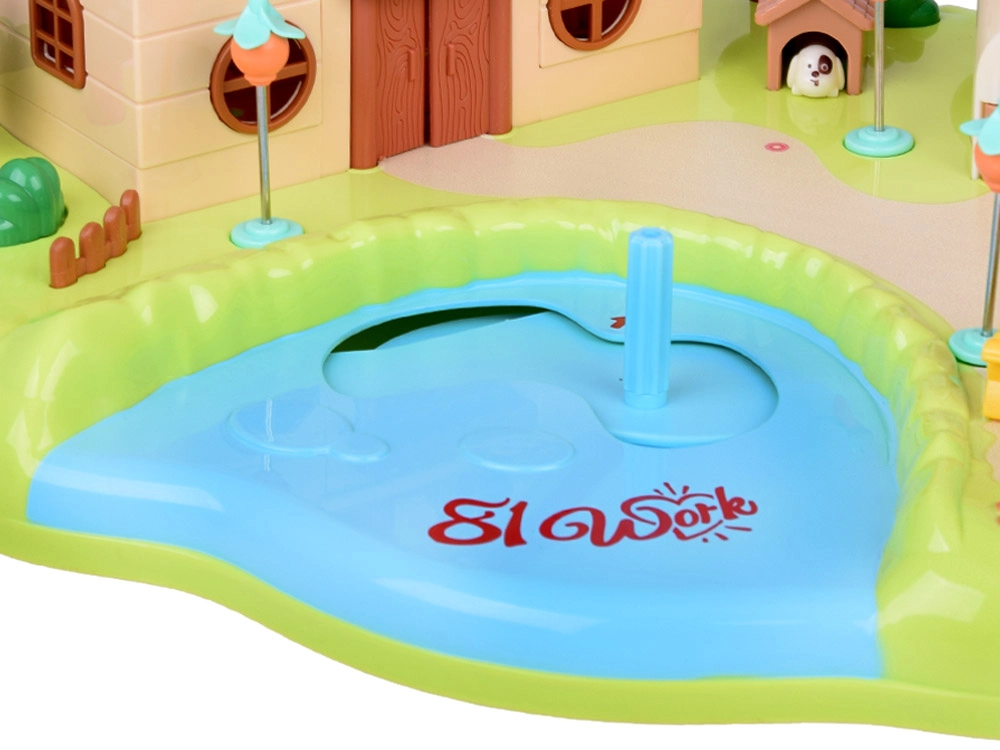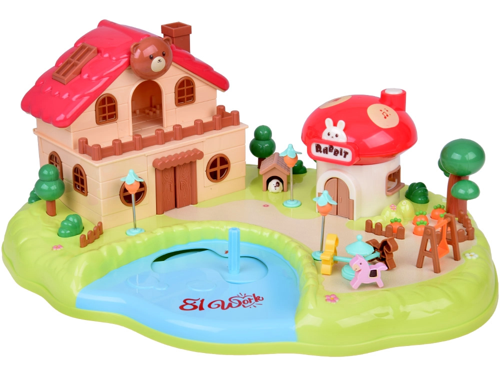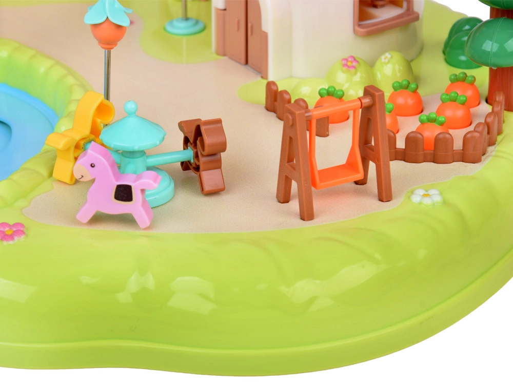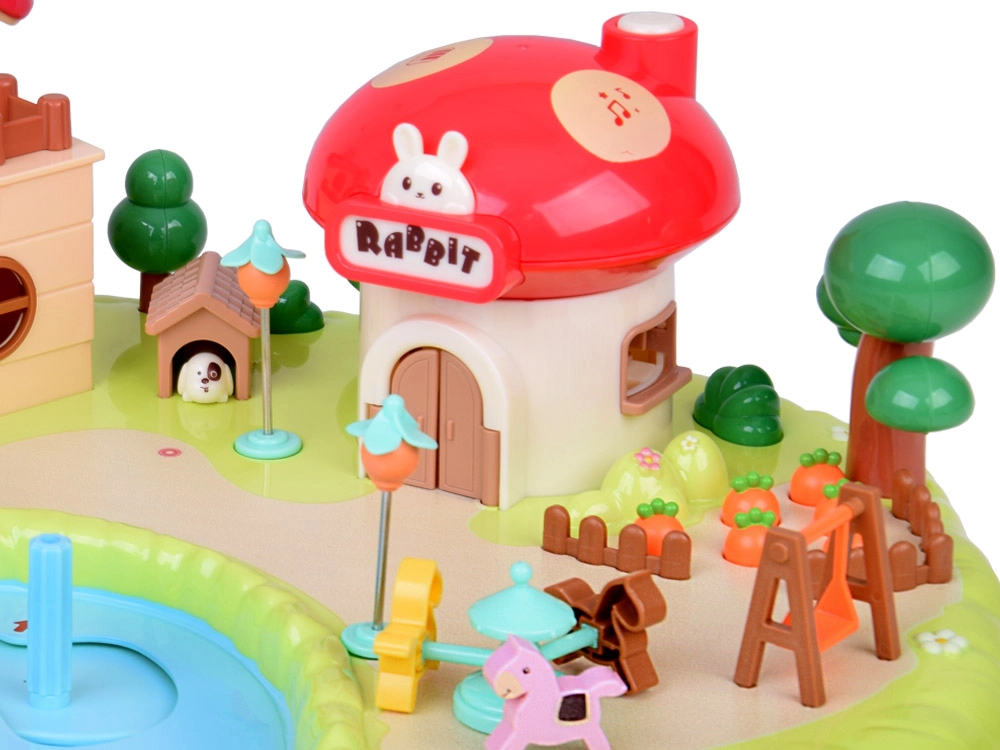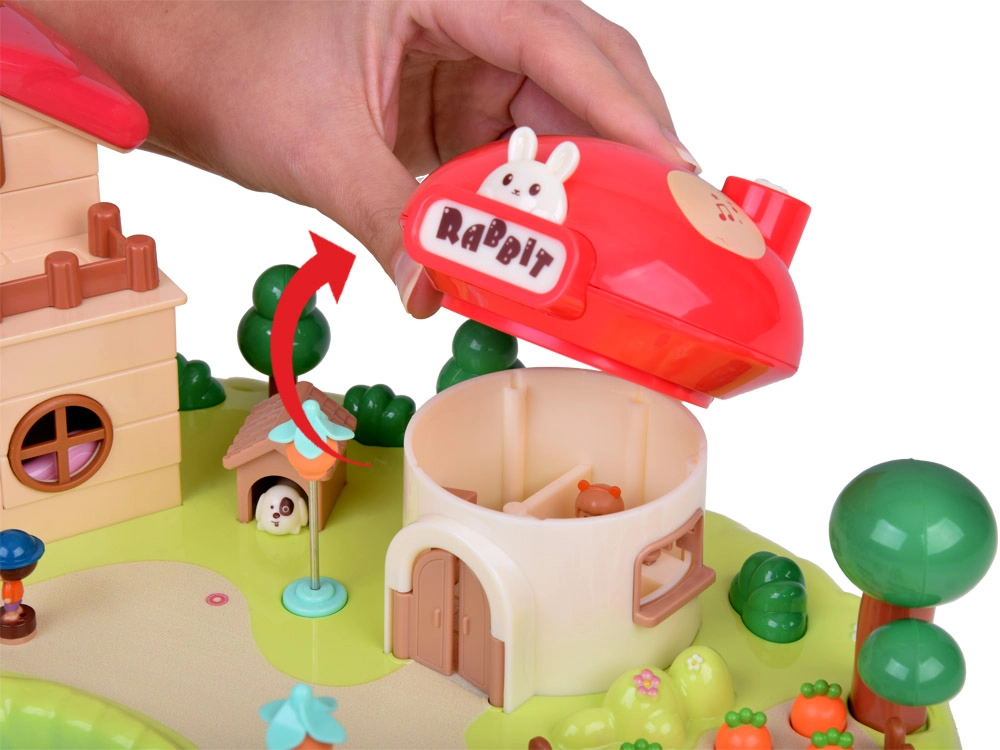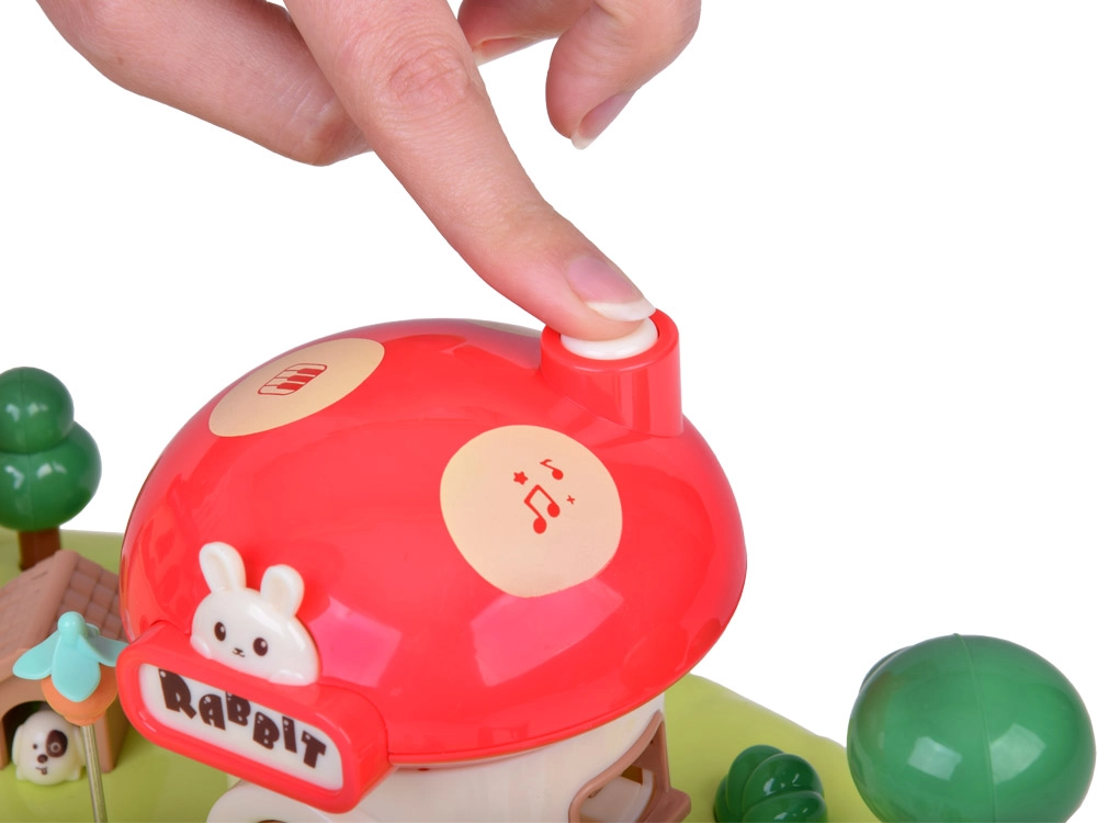 Тази интерактивна магнитна къщичка създава пъстра игрална сцена с градина, езерце и гъбено магазинче. Децата с помощта на управляваща пръчица местят фигурките по синьото езерце, които благодарение на магнитната индукция се движат плавно из цялата сцена – от лехата с моркови, през площадката, чак до посещението при домашния любимец. Гъбената къщичка има функционални бутони за светлинни и звукови ефекти и стилен надпис „Rabbit“, който светва в ритъм.