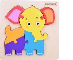 Дървената вкладайка във форма на слон е чудесен първи пъзел за най-малките. Благодарение на 6-те цветни части децата се учат правилно да поставят формите в дървената подложка, като естествено развиват координацията око–ръка, търпението и концентрацията. Ярките цветове привличат вниманието и подпомагат ученето на цветовете по време на игра.