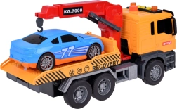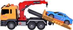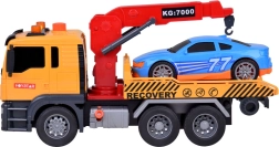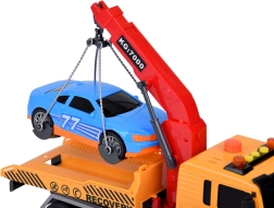 Към комплекта е включен и син спортен автомобил, който идеално пасва на автовоза. Цялата играчка е в реалистични цветове – жълто, сиво, червено и синьо.