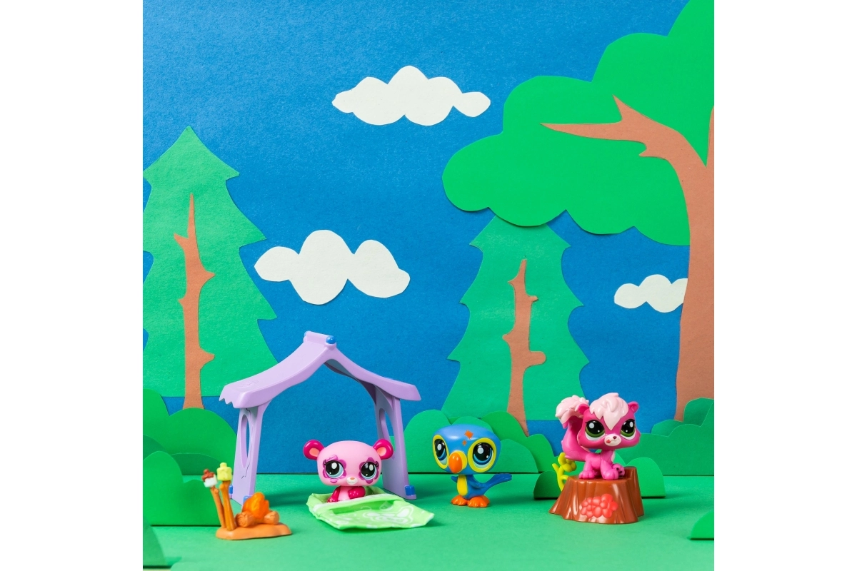Започнете своето къмпинг приключение с три вълшебни животинки от Littlest Pet Shop, включително панда, тукан и катерица. С тези фигурки можете да развихрите креативността си и да се забавлявате край малък огън или да релаксирате на удобен дървен пън. Комплектът включва: