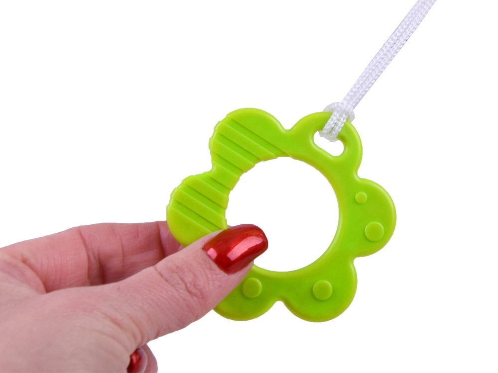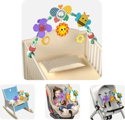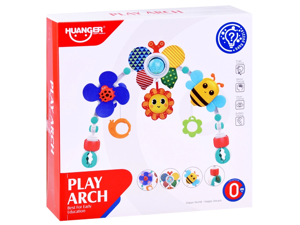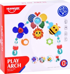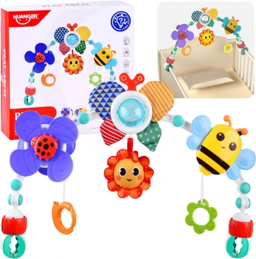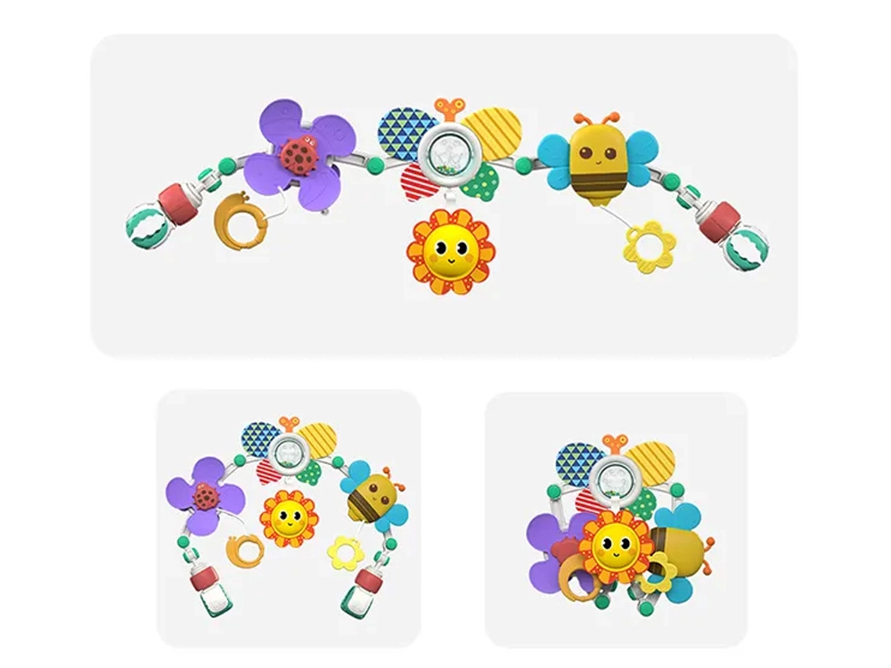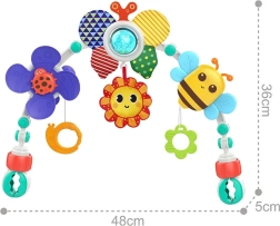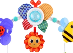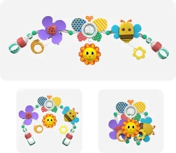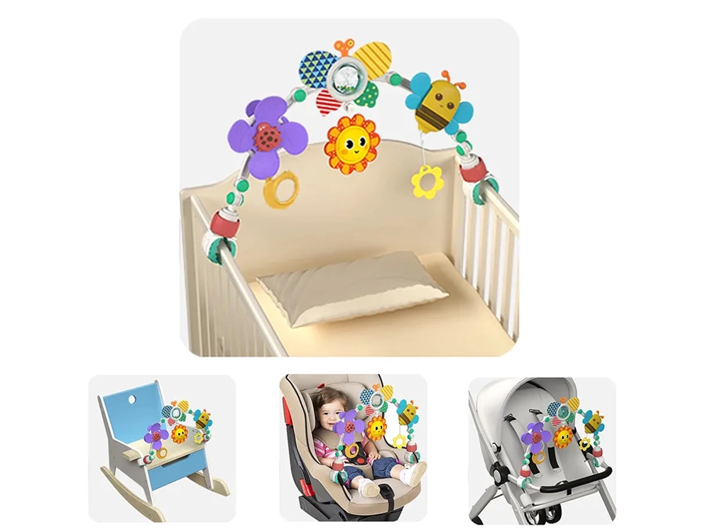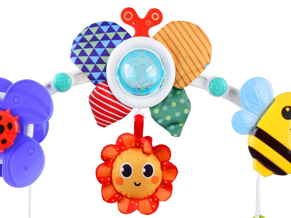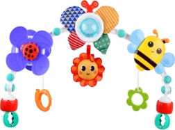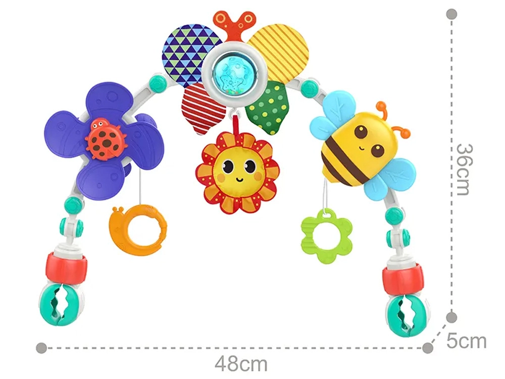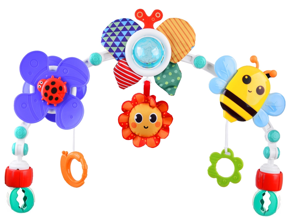 Тази цветна играчка-арка е проектирана за лесно закрепване към количка, кошара и столче за кола. Благодарение на регулируемия ъгъл лесно я приспособявате към нуждите и позицията на бебето. Висящите елементи с дрънкалки и текстури приканват към изследване, хващане и протягане на ръчичките.