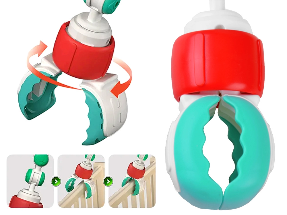 Практичните щипки позволяват бърз монтаж към количка, кошара и столче за кола, така че забавлението е винаги с вас.