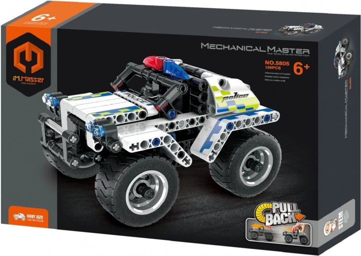 Конструкторът iM.Master носи на децата часове творческо забавление. От 199 издръжливи елемента лесно ще сглобите детайлен полицейски автомобил, който след навиване на пружинния механизъм потегля напред. Децата тренират въображението, логическото мислене и търпението си и могат да сглобяват не само по инструкция, но и собствени оригинални модели.