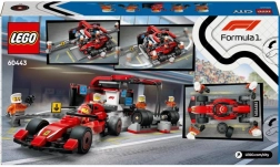 Включени са червен болид F1 Ferrari, минифигурка на шофьор и четирима членове на екипа за автентични състезателни сценарии и отборна работа.