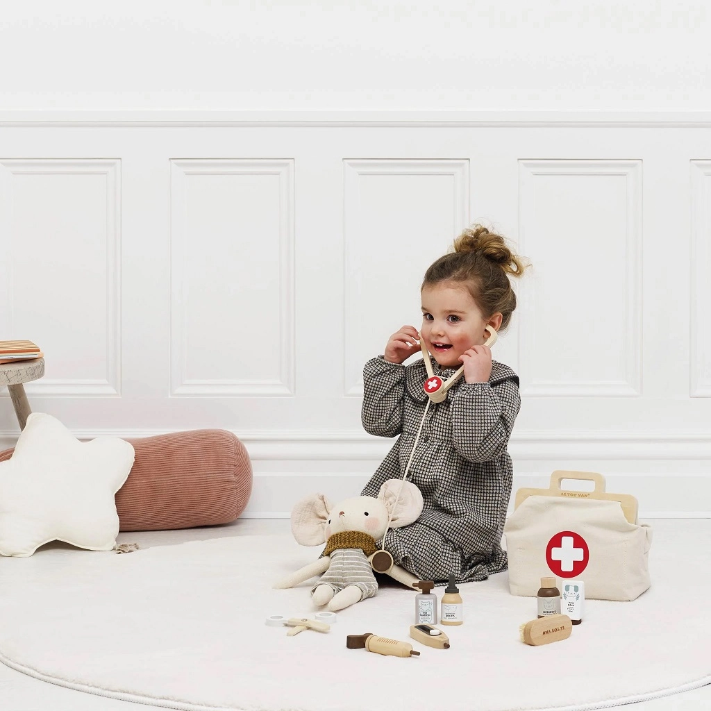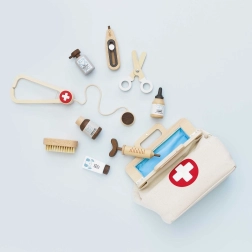Тази уникална ветеринарна чанта с аксесоари е идеална за малки любознателни ветеринари. Комплектът включва 10 броя инструменти, изработени от байцвано естествено дърво с FSC сертификация, което гарантира екологичен и устойчив произход. Децата могат да се потопят в света на грижата за животни благодарение на разнообразните инструменти като стетоскоп, ножичка и спринцовка. Чантата е проектирана да стимулира креативността и да развива въображението.