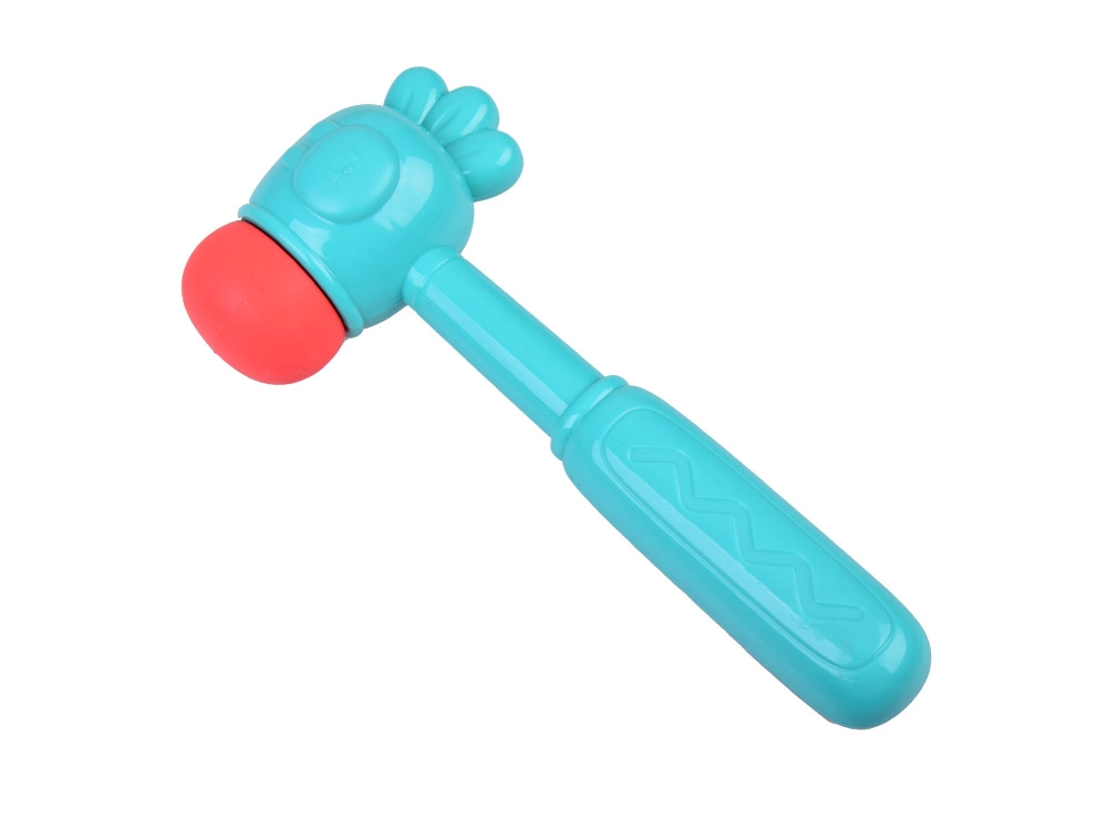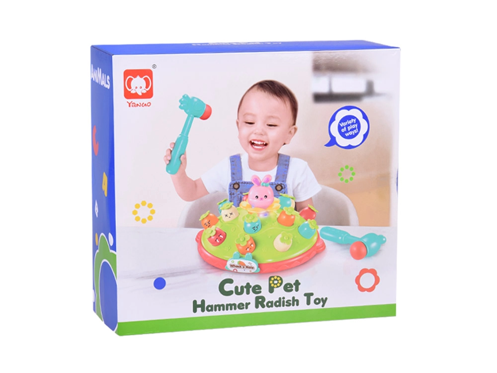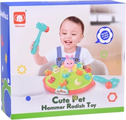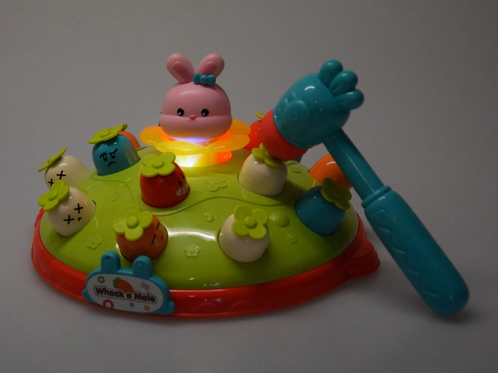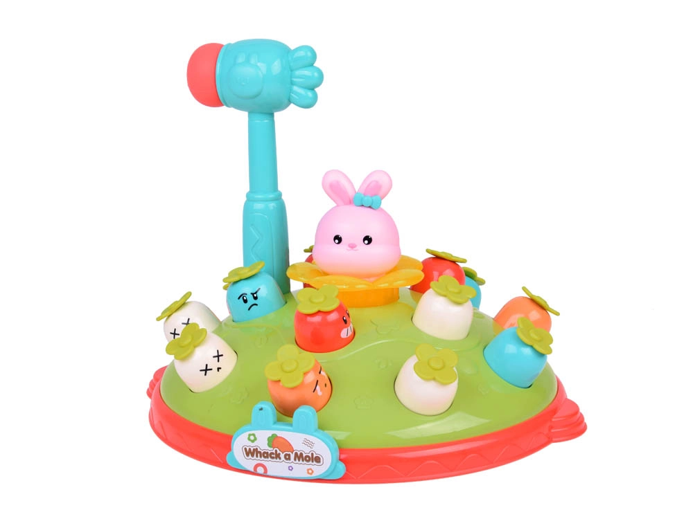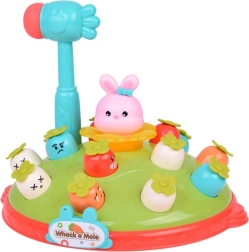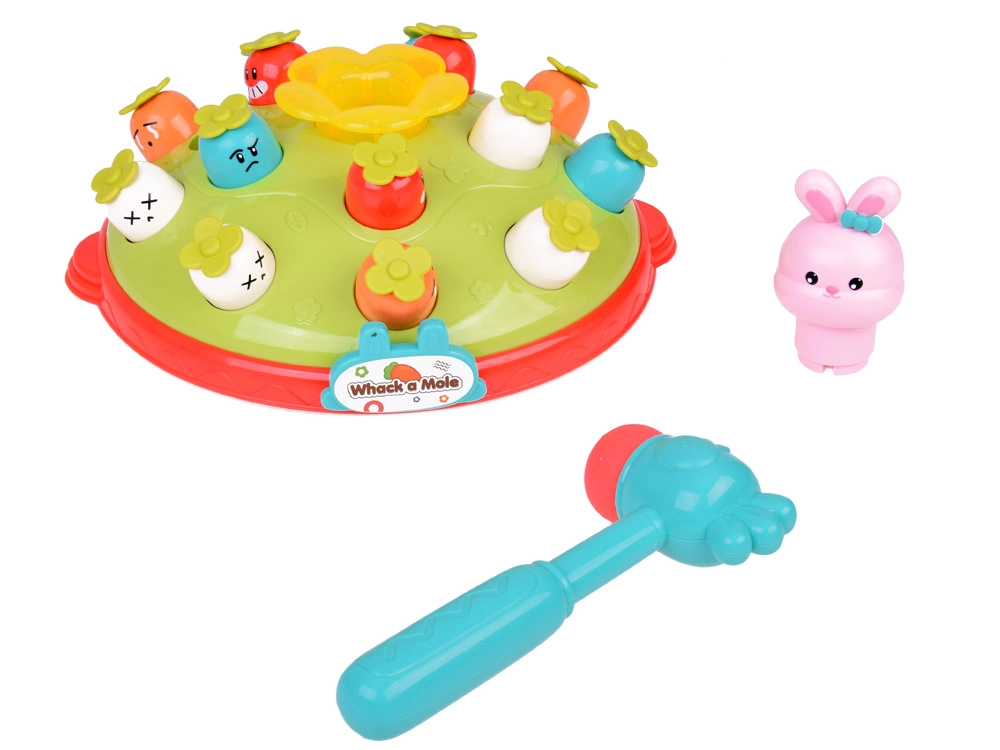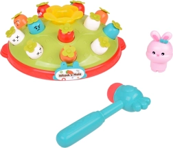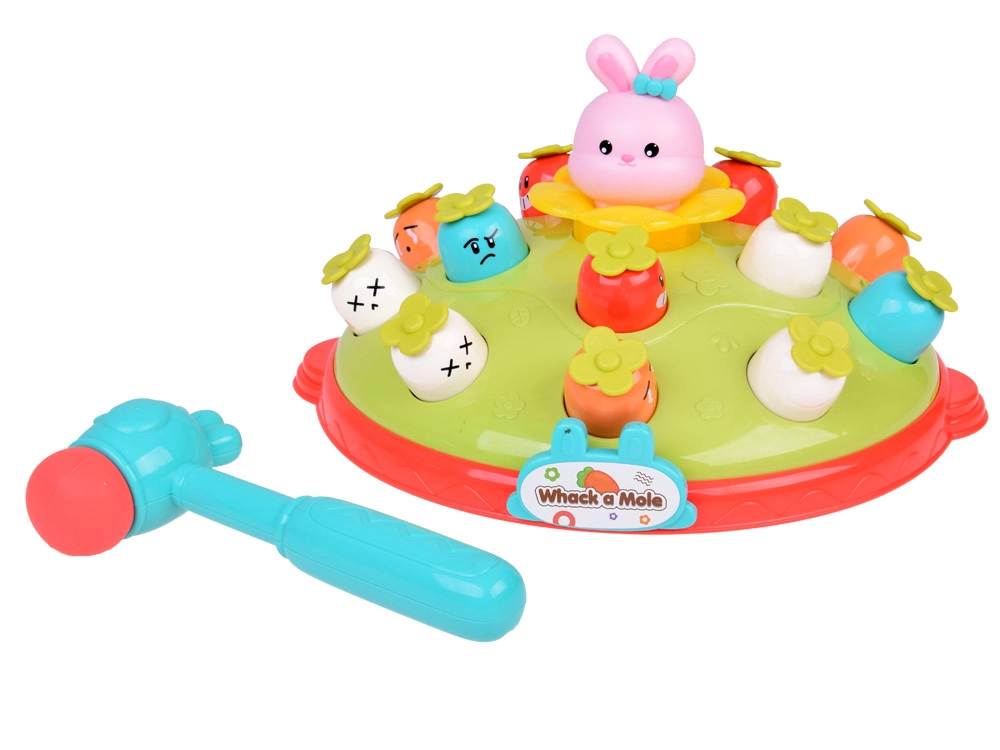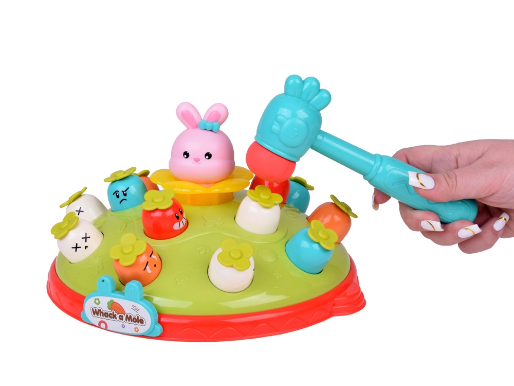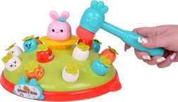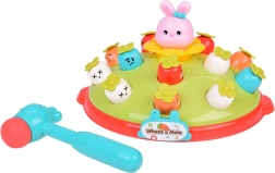 Играта „Удари с чукчето“ предлага на децата възможност да развиват своите моторни умения в забавна среда. На цветна платформа, наподобяваща поляна, са разположени морковчета с различни цветове и изражения, заедно с розово зайче, чиято задача е да изскача при удар с чукчето. Играта е съпроводена от весела мелодия, която привлича вниманието на децата. Платформата има две нива на морковчетата и умен механизъм, който при завъртане на зайчето кара да изскочи друго морковче от горното ниво.